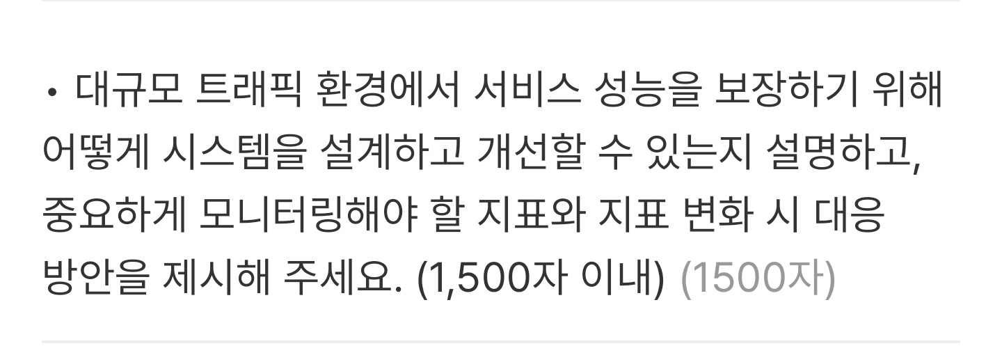 Question) 대규모 트래픽 환경에서 서비스 성능을 보장하기 위해 어떻게 시스템을 설계하고 개선할 수 있는지 설명하고, 중요하게 모니터링해야 할 지표와 지표 변화 시 대응 방안을 제시해 주세요. (1,500자 이내) (1500자) 🤔😔 그걸 알면 내가 신입으로 너희 회사에 지원 하겠니? 싶어서 흥분한 마음을 가라앉히고 Google Gemini pro 2.5 에게 질문을 해보았다. here is the Ans.) 중간에 2. 항목은 표가 Markdown 형식으로 깨져 나오므로, 제대로 보시려면 첨부된 MS Word 파일 내용에 있는 Table 을 참조 해주시면 좋겠습니다. 👉 안녕하세요! 정말 좋은 질문을 주셨네요. 대규모 트래픽 환경에서 안정적인 서비스를 제공하는 것은 모든 개발자와 엔지니어의 핵심적인 과제이자 목표라고 할 수 있습니다. 저의 의견과 조사한 내용을 종합하여 단계별로 상세하고 친절하게 설명해 드릴게요. 🚀 1. 대규모 트래픽 대응 시스템 설계 및 개선 방안 대규모 트래픽을 감당하기 위한 시스템 설계는 '하나의 거대한 컴퓨터'를 만드는 것이 아니라, '여러 대의 컴퓨터가 효율적으로 협력하는 구조'를 만드는 데 초점이 맞춰져 있습니다. 가. 확장성 (Scalability) 확보 가장 기본이 되는 개념입니다. 트래픽이 늘어날 때 시스템이 얼마나 유연하게 대응할 수 있는지를 의미하며, 두 가지 방향으로 나뉩니다. * 스케일 업 (Scale-Up, 수직 확장): 기존 서버의 사양(CPU, RAM 등)을 높이는 방식입니다. * 장점: 설계가 간단하고 적용이 쉽습니다. * 단점: 하드웨어 성능 향상에 한계가 있고, 비용이 기하급수적으로 증가하며, 해당 서버에 장애 발생 시 전체 서비스가 중단될 수 있습니다. (단일 장애점, SPOF) * 스케일 아웃 (Scale-Out, 수평 확장): 비슷한 사양의 서버 수를 늘려서 트래픽을 분산하는 방식입니다. 현대의 대규모 서비스는 대부분 이 방식을 채택합니다. * 장점: 서버를 추가하는 것만으로 거의 무한대에 가깝게 확장할 수 있습니다. 한 대의 서버에 장애가 발생해도 다른 서버로 서비스를 계속할 수 있어 안정성이 높습니다. * 단점: 여러 서버를 관리해야 하므로 시스템 복잡도가 증가합니다. 나. 부하 분산 (Load Balancing) 스케일 아웃을 했다면, 들어오는 요청(트래픽)을 여러 대의 서버에 골고루 나눠주는 역할이 필요합니다. 이때 **로드 밸런서(Load Balancer)**를 사용합니다. * 역할: 특정 서버에 트래픽이 몰리지 않도록 분산시켜 병목 현상을 막고, 특정 서버에 장애가 발생하면 해당 서버로는 트래픽을 보내지 않아 서비스 연속성을 보장합니다. (Health Check 기능) * 개선 방안: 트래픽 특성에 맞는 분배 알고리즘(Round Robin, Least Connections 등)을 선택하고, 필요에 따라 이중화(HA) 구성을 통해 로드 밸런서 자체의 장애에 대비합니다. 다. 데이터베이스 최적화 (Database Optimization) 사용자가 많아질수록 데이터베이스는 가장 먼저 병목 지점이 될 확률이 높습니다. * 읽기/쓰기 부하 분리 (Replication): 데이터를 복제하여 원본(Master) DB는 데이터 변경(쓰기) 작업을, 복제본(Slave) DB는 데이터 조회(읽기) 작업을 처리하도록 역할을 나눕니다. 대부분의 서비스는 쓰기보다 읽기 작업이 훨씬 많기 때문에 이 구조만으로도 성능이 크게 향상됩니다. * 데이터 분산 저장 (Sharding): 하나의 거대한 테이블을 특정 기준(예: 사용자 ID)에 따라 여러 개의 작은 테이블이나 다른 데이터베이스로 분리하여 저장하는 방식입니다. 데이터가 물리적으로 분산되어 조회 및 변경 속도가 빨라집니다. * 인덱싱(Indexing) 및 쿼리 최적화: 자주 조회되는 데이터에 대한 인덱스를 생성하여 검색 속도를 높이고, 비효율적인 SQL 쿼리를 수정하여 DB 부하를 줄이는 것은 기본적이면서도 매우 중요합니다. 라. 캐싱 (Caching) 전략의 적극적인 활용 💡 캐시는 한 번 처리된 데이터를 빠르게 접근 가능한 임시 공간에 저장해두고, 동일한 요청이 왔을 때 DB까지 가지 않고 저장된 데이터를 바로 반환하는 기술입니다. * 글로벌 캐시 (Global Cache): Redis, Memcached와 같은 별도의 캐시 서버를 이용하여 여러 서버가 데이터를 공유합니다. DB의 부하를 획기적으로 줄여주는 가장 효과적인 방법 중 하나입니다. * CDN (Content Delivery Network): 이미지, 동영상, CSS 파일 등 정적인 콘텐츠를 사용자와 지리적으로 가까운 서버에 미리 복사해두고, 사용자가 요청 시 가장 가까운 서버에서 콘텐츠를 전송받게 하는 기술입니다. 이를 통해 서버의 부하를 줄이고 사용자에게 빠른 로딩 속도를 제공합니다. 마. 비동기 처리 (Asynchronous Processing) 시간이 오래 걸리는 작업(예: 동영상 인코딩, 대량 이메일 발송)을 사용자의 요청 흐름과 분리하여 별도로 처리하는 방식입니다. * 메시지 큐 (Message Queue): RabbitMQ, Kafka와 같은 메시지 큐 시스템을 도입합니다. 사용자의 요청을 일단 '접수'했다고 빠르게 응답한 뒤, 실제 오래 걸리는 작업은 큐에 넣어두고 별도의 작업 서버(Worker)들이 순차적으로 처리하게 합니다. 이를 통해 사용자는 오래 기다릴 필요가 없고, 시스템 전체의 처리 효율이 높아집니다. 2. 중요 모니터링 지표 📊 시스템을 아무리 잘 설계해도, 실제로 어떻게 동작하는지 관찰하지 않으면 문제점을 알 수 없습니다. 다음 지표들은 반드시 지속적으