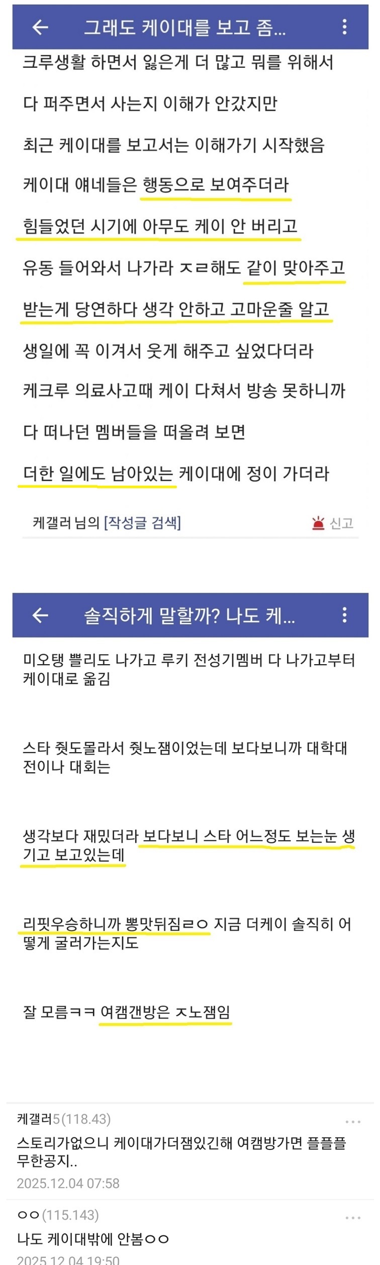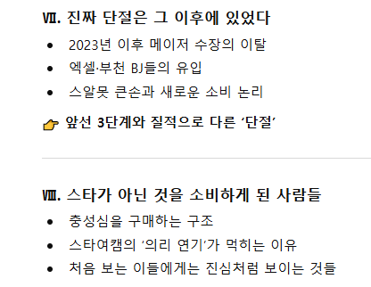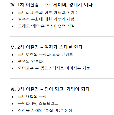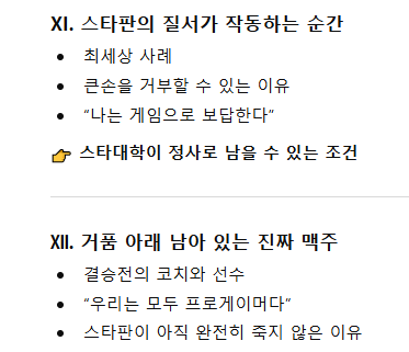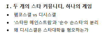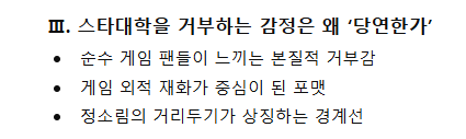 어느 날 아침 우리는 출발한다로 시작해서 먼 곳을 향해 떠났다. 먼 곳은 멀다는 것만으로도 아름답다. 배의 난간에서 낯선 남자는 여자에게 묻는다. 어디까지 가십니까. 어디까지 가느냐구요. 이 배를 탈 그때부터 우리가 내릴 곳은 다 함께 정해져 있지 않았나요. ![]() 현재 스타 커뮤니티의 본거지는 펨코스갤입니다. 그런데 그곳과 전혀 다른 성격의 디시스갤도 활성화되어 있읍니다. 과거와는 비교도 안될 만큼 소규모인 채로. 온겜 시절의 디시스갤은 최초의 이스포츠 시대를 열었던 국민게임 관련 커뮤였다면 이제는 순수한 고전게임1로서의, 게임 자체에 관한 이야기 위주로 올라옵니다. 개념글 절반 이상이 종족벨런스 싸움인게 어이없지만 여튼 직접 손스타를 하는 사람들 중 일부가 디시스갤에 모이고 심지어 입문자들도 간간히 보입니다. 디시스갤 유저들은 현시점 스타판의 메인스트림인 스타대학을 좋아하지 않읍니다 여자들의 수준 낮은 게임이 수요가 있고 거기에 꽤나 의미부여가 된다는 사실 자체를 도저히 인정할 수 없다는 주의. 심지어 그들이 돈까지 잘 벌고 있다는 사실이 화가 나는겁니다. 내가 저 여자보다 스타 더 잘하는데 쟤는 여자라는 이유만으로 편하게 떵떵거리며 사네? ![]() 스타여캠들이 BJ로서 리스크 있는 활동을 한다는 사실로 디시스갤러들을 반박하고 싶지는 않읍니다 다만 지금의 스타대학은 그것이 일부 씹덕들에게 좋은 놀이터가 되었다는 의미 이상으로, '스타판'이라고 통칭되는 전체 세계관에서 스타대학의 발생과 진화는 온겜/엠겜 양대리그 시절로부터 한 흐름으로 이어져 내려오는, 분리해내기 어려운 역사의 과정인데 예를 들면 박태민의 현역 시절 커리어, 양대리그 우승에 WCG까지 석권한 업적과 아프리카에서 정중만, 쌍디, 마예준을 도와 순차적으로 세개 대학의 초기 총장을 맡으면서 스타 문외한인 그들을 스타판에 정착시키고 그들을 통해 유치한 큰손들과 그들이 없었다면 스타방송을 접었을지도 모를 수많은 하꼬 코치들, 스타여캠들에게 길냥이보호소를 제공한 공로를 저울질하면 100년이 지난 후 돌아볼 때 후자의 가치가 더 가볍게 평가될 가능성은 매우 낮읍니다. (물론 전자가 선행되었기 때문에 그 후광에 힘입어 대학판 개척이 가능했던거라 둘을 완전히 분리시킬 수는 없읍니다) ![]() 제가 안타까운건 이런 식의 역사적 의의와는 별개로 순수 스타1 애호가들이 스타대학이라는 신문물을 정사에 편입시키는데 강한 거부감을 느끼는 현상이 어쩌면 당연하다는 인식 때문입니다. 이것은 굉장히 이질적인 포멧입니다. 단순히 여자가 주인공이어서, 라는 문제가 아닙니다. 스타대학에서 제공하는 재화의 성격이 더이상 게임이 전부가 아니게 된것입니다. 디시스갤러들 같은 헤비한 손스타 유저 말고도, 더 광범위하고 평범한 과거의 스타팬들이나 정소림 같은 업계 관련자들까지 음 스타대학은 좀.. 하고 거리를 두게 되는 이유가 있읍니다. 특히 정소림 같은 인물이 고민끝에 합류를 포기한건 저로서는 가슴아픈 일이었읍니다. 아마 정소림 vs 임성춘 박상현 이승원과의 차이가 이 새로운 역사를 받아들이냐 마느냐 하는 경계선일 것입니다. 양 진영의 중심에서 가장 멀고 상대 진영의 끝자락에 가장 가까운. ![]() 이 문제는 스타리그가 문을 닫은 직후의 아프리카 시절로 거슬러 올라갑니다. 내 청춘의 우상들이 별풍선 몇푼에 광대가 되는걸 납득할 수 없는 사람들이 많았읍니다. 스타여캠을 게이머로 볼 수 없다는 사람들만큼이나 많았죠. 하지만 무적의 논리, <그래서 너가 쟤들 먹여살릴래>를 이길 수는 없었읍니다. 게다가 광대가 되든 말든 아무튼 그들은 계속해서 게임을 했기 때문에 그때까지만 해도 실질적 알맹이는 변한게 없었읍니다. 기업들과 기성 방송국이 제공하는 양지의 삐까번쩍한 무대가 사라졌을 뿐, 피지컬은 해를 넘길수록 떨어져갈지언정 어쨌든 현존 최고의 스타1 게이머들의 플레이는 좋든 싫든 아프리카에서 보아야 했죠. 그러다가 2018년 즈음을 전후해서 <스타여캠>이라는 존재가 등장했고, 그들과의 협업은 프로게이머가 광대짓을 한다는 것과는 차원이 다른 지각변동의 시작이었읍니다. 그래도 한 3~4년 정도는 소박했읍니다. 스타여캠을 좋아하는 이른바 '물소팬'이라는 계층이 형성됐고 이제 아프리카 스타판을 즐기는 방식은 양분되어 게시판도 둘로 나뉘어 갈라서게 됩니다. 어쩌면 그당시 와이고수의 '스타 방송 게시판'은 현재의 펨코스갤로 이어지고, '전략/전술 게시판'은 현재의 디시스갤로 이어졌다고 봐도 큰 무리는 없을지도 모릅니다. 2022년, 드디어 스타대학이라는 놀이터가 개장하는데 이때의 광기에 대한 이야기는 좀 접어두고, 이 새로운 포멧은 겉으로 보기에는 그동안 발생한 스타여캠이라는 재료들을 모아 집단적인 컨텐츠를 만들어낸 것이라서 직전의 흐름과 같이 묶어서 보기 쉽지만 이 시기 역시 또 한번의 이질성이 추가되는 분기점입니다. 대학 발생 이전에도 전프로 스승과 스타여캠간의 교육컨텐츠가 많았고 이를 기존의 메프를 대체할 새로운 미래의 시장으로 예측하는 전프로들도 생기기 시작했지만, 그