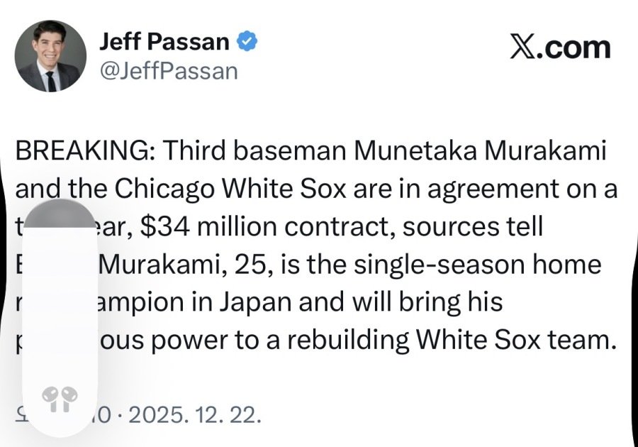 Subject   [MLB] 무라카미 무네타카 2년 34M 화이트삭스행