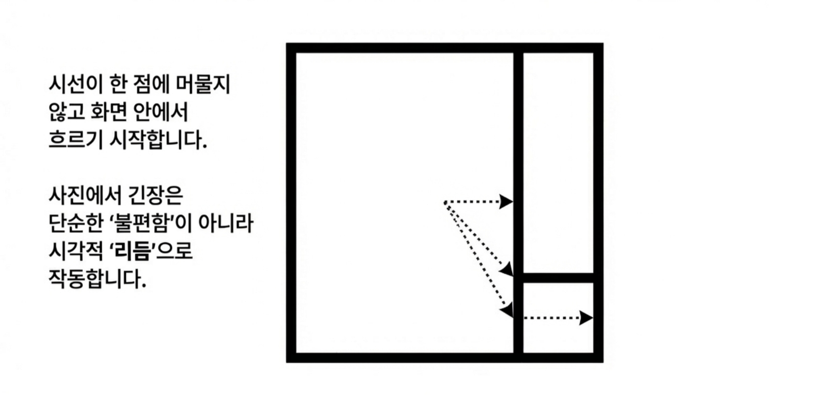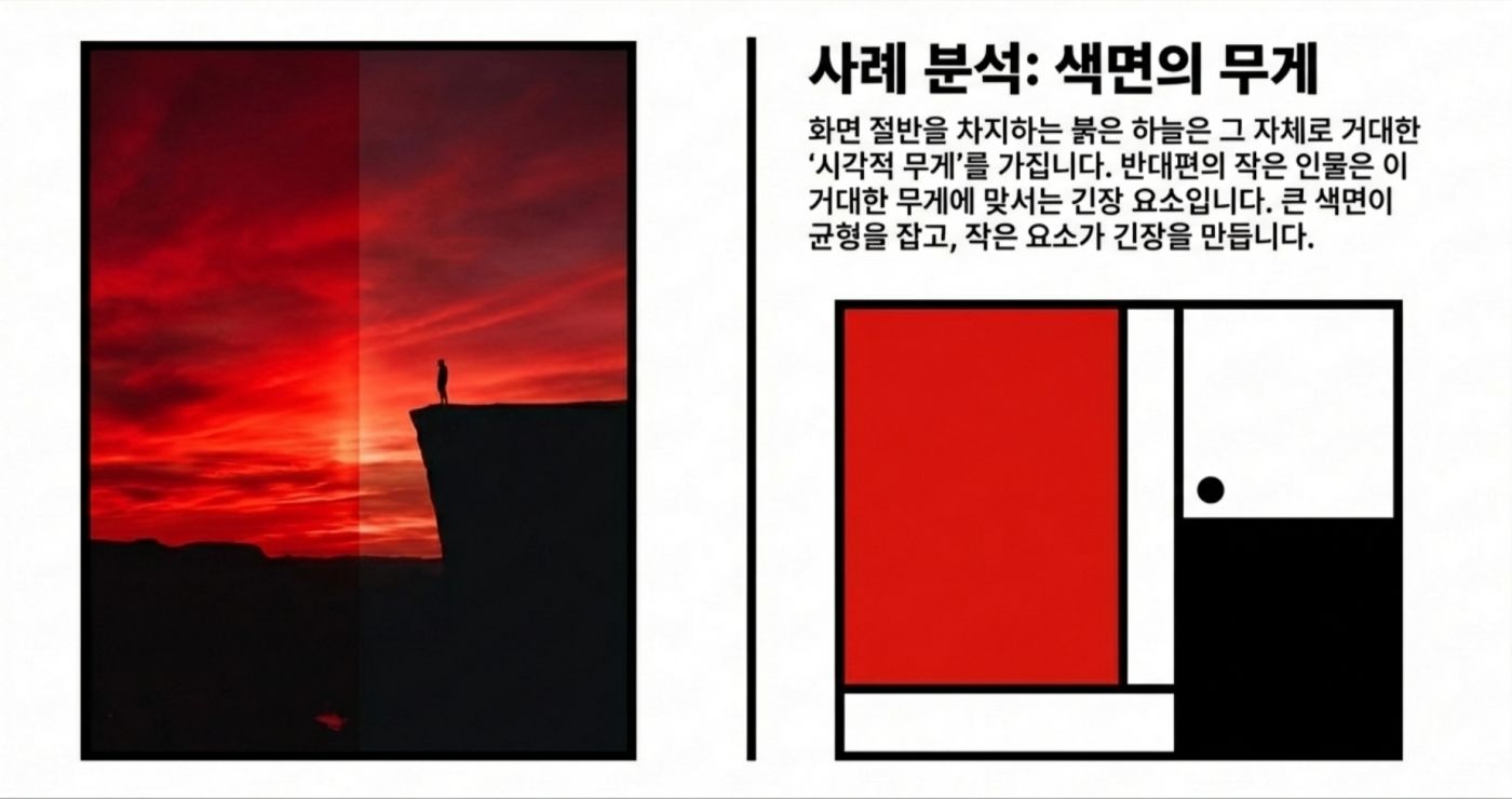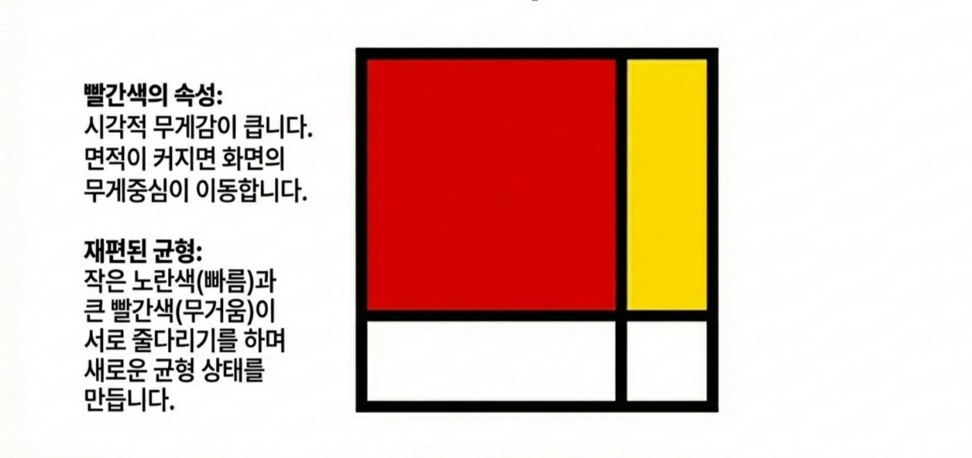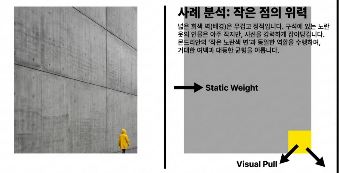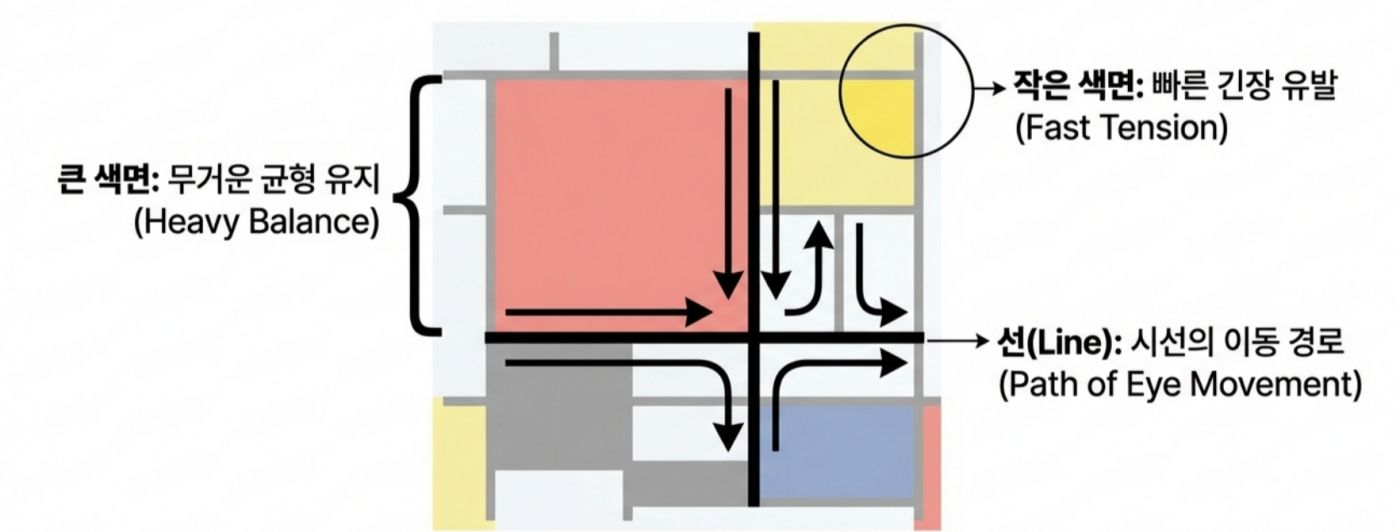 *어디까지나 제가 사진을 찍으면서 느꼈던 개인적인 감상임을 밝혀 둡니다* 제가 사진을 아주 잘 찍는 사람은 아니지만, 그래도 취미로 꽤 오래하고 있는 사람으로서 제 기준에서 좋은 사진을 고르는 눈은 어느정도 있지 않나 생각합니다. 야구팬이라고 야구를 잘해서 야구선수의 플레이를 비판하지 못하는 것도 아니고, 페이커만큼 플레이는 못하더라도 경기 보고 감상은 이야기할 수 있는 것 아니겠습니까? 그런 의미에서 제가 사진을 찍으며 느꼈던 지점들이 있어 오랜만에 사진에 관한 글을 써봅니다. 2. 실패하지 않는 사진 우리는 흔히 사진을 배울 때 삼분할법이나 황금비와 같은 규칙을 정답처럼 따르곤 합니다. 이러한 기법들은 화면을 매우 안정적으로 만들어주지만, 때로는 완벽하게 균형 잡힌 사진이 오히려 지루하거나 심심하게 느껴질 때가 있습니다. 반면 어떤 사진은 다소 불안정해 보임에도 불구하고 우리의 시선을 강렬하게 사로잡습니다. ![]() 3. 긴장과 균형 그렇다면 무엇이 이와 같은 차이를 만들어 낼까요? 그 차이는 바로 ‘긴장(Tension)’에 있습니다. 이 긴장이라는 요소는 '균형'과는 대립되는 요소입니다. ![]() 균형은 정지된 상태가 아닌 출발점입니다 일반적인 의미에서 "균형(Balance)'이란 힘이 서로 상쇄되어 아무런 사건도 일어나지 않는 ‘정리된 상태’를 말합니다. 가로와 세로를 정확히 4분할 한 화면처럼 완벽한 대칭을 이루는 구도는 시선을 중앙에 고정시켜 버리며, 시각적인 드라마나 에너지를 만들어내지 못합니다. ![]() 반면 긴장은 힘의 차이에서 발생하는 에너지이며, 비대칭과 불균형이 만들어내는 시각적 활력입니다. 매력적인 사진은 단순히 균형을 깨뜨리는 것이 아니라, 균형 위에 ‘차이(Difference)’를 얹음으로써 완성됩니다. ![]() 4. 선과 색이 만드는 리듬 (1) 시선을 움직이는 방향성 단순한 점에 선이 더해지면 시선은 한곳에 머물지 않고 흐름을 따라 이동합니다. 이때의 긴장은 불편함이 아니라 시선을 유도하는 ‘리듬’으로 작동합니다. ![]() (2) 색채의 속도와 무게 이 구도에서 색깔을 하나 추가해 볼까요? 노란색은 면적이 작더라도 인지 속도가 매우 빨라 순간적으로 시선을 잡아당기는 ‘심리적 중심’ 역할을 합니다. ![]() 이처럼 노란색 지점이 만들어낸 긴장을 해소시켜 봅시다. 반대쪽에 좀 더 넓은 면적에 빨간색을 추가해보죠. 빨간색은 시각적 무게감이 커서 화면 전체의 무게 중심을 이동시킵니다. ![]() (3) 동적 균형(Dynamic Equilibrium) 작은 노란색의 ‘속도’와 큰 빨간색의 ‘무게’가 화면 안에서 서로 줄다리기를 할 때, 비로소 팽팽하게 당겨진 ‘살아있는’ 균형이 형성됩니다. 어디서 많이 본 구도 아닌가요? 바로 몬드리안의 컴포지션 작품에서 볼 수 있는 이미지의 전개 양상입니다. 화가 피에트 몬드리안은 사물과 풍경을 제거하고 오직 수직·수평의 선과 제한된 색상만으로 긴장과 균형의 공존을 실험했습니다. ![]() ![]() 그의 원리를 사진 프레이밍에 적용해 보면 다음과 같은 시각적 리듬을 발견할 수 있습니다. ![]() 결국 좋은 사진이란 모든 힘이 멈춰버린 ‘완성된 안정’이 아니라, 요소들 사이의 힘이 팽팽하게 맞서며 ‘치열하게 유지되는 긴장’을 담고 있는 사진입니다. 이를 반영한 몇가지 사진의 예시를 한번 찾아봅시다. ![]() ![]() 몬드리안이 선과 색의 대비를 통해 에너지를 표현했듯, 우리도 프레임 안의 요소들에 ‘차이’를 주고 시선의 흐름을 유도한다면 더욱 생동감 넘치는 사진을 기록할 수 있을 것입니다. 5. 결론 매력적인 사진은 보는 이를 편안하게 잠들게 하는 사진이 아니라, 팽팽하게 당겨진 활시위처럼 언제라도 튕겨 나갈 듯한 에너지를 품고 있는 사진입니다. 완벽한 균형이라는 '출발점'에서 벗어나, 불균형과 비대칭이 만드는 긴장을 기꺼이 수용해 보시기 바랍니다. 그 팽팽한 줄다리기가 유지되는 찰나의 순간, 사진의 프레임은 단순한 재현을 넘어 하나의 예술적 사건이 될 것입니다. 14