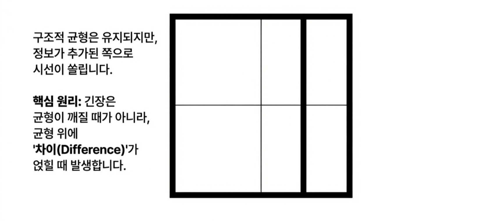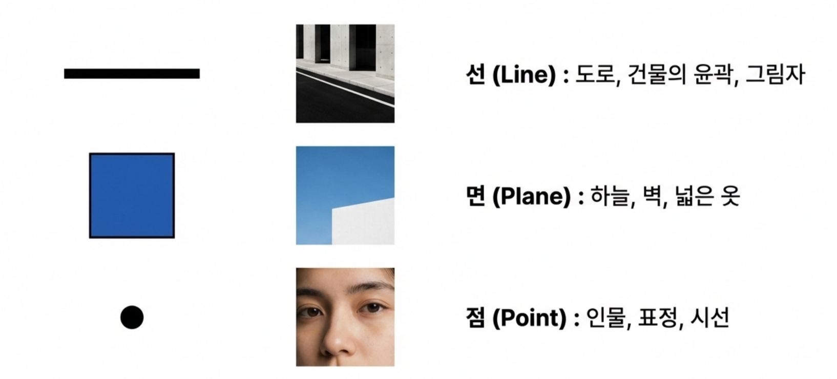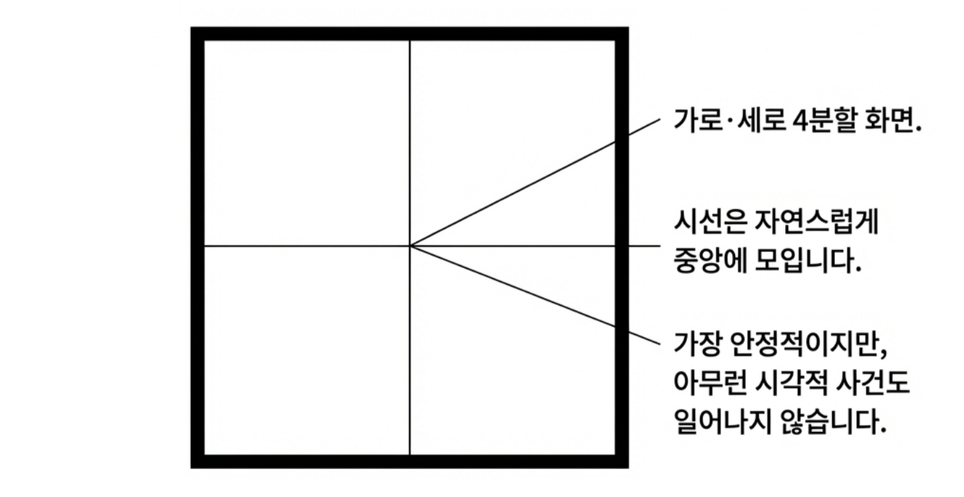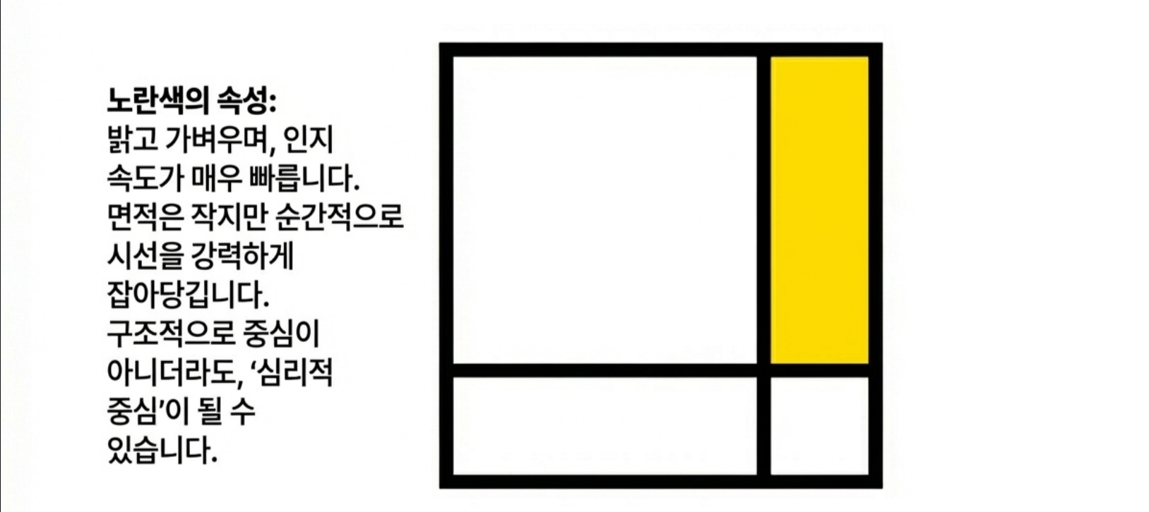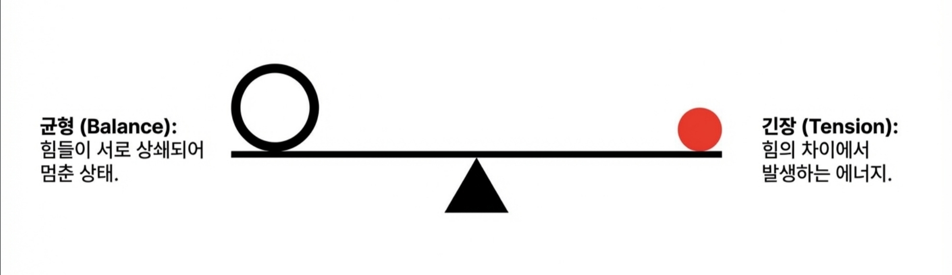 *어디까지나 제가 사진을 찍으면서 느꼈던 개인적인 감상임을 밝혀 둡니다* 제가 사진을 아주 잘 찍는 사람은 아니지만, 그래도 취미로 꽤 오래하고 있는 사람으로서 제 기준에서 좋은 사진을 고르는 눈은 어느정도 있지 않나 생각합니다. 야구팬이라고 야구를 잘해서 야구선수의 플레이를 비판하지 못하는 것도 아니고, 페이커만큼 플레이는 못하더라도 경기 보고 감상은 이야기할 수 있는 것 아니겠습니까? 그런 의미에서 제가 사진을 찍으며 느꼈던 지점들이 있어 오랜만에 사진에 관한 글을 써봅니다. 2. 실패하지 않는 사진 우리는 흔히 사진을 배울 때 삼분할법이나 황금비와 같은 규칙을 정답처럼 따르곤 합니다. 이러한 기법들은 화면을 매우 안정적으로 만들어주지만, 때로는 완벽하게 균형 잡힌 사진이 오히려 지루하거나 심심하게 느껴질 때가 있습니다. 반면 어떤 사진은 다소 불안정해 보임에도 불구하고 우리의 시선을 강렬하게 사로잡습니다. ![]() 3. 긴장과 균형 그렇다면 무엇이 이와 같은 차이를 만들어 낼까요? 그 차이는 바로 ‘긴장(Tension)’에 있습니다. 이 긴장이라는 요소는 '균형'과는 대립되는 요소입니다. ![]() 균형은 정지된 상태가 아닌 출발점입니다 일반적인 의미에서 "균형(Balance)'이란 힘이 서로 상쇄되어 아무런 사건도 일어나지 않는 ‘정리된 상태’를 말합니다. 가로와 세로를 정확히 4분할 한 화면처럼 완벽한 대칭을 이루는 구도는 시선을 중앙에 고정시켜 버리며, 시각적인 드라마나 에너지를 만들어내지 못합니다. ![]() 반면 긴장은 힘의 차이에서 발생하는 에너지이며, 비대칭과 불균형이 만들어내는 시각적 활력입니다. 매력적인 사진은 단순히 균형을 깨뜨리는 것이 아니라, 균형 위에 ‘차이(Difference)’를 얹음으로써 완성됩니다. ![]() 4. 선과 색이 만드는 리듬 (1) 시선을 움직이는 방향성 단순한 점에 선이 더해지면 시선은 한곳에 머물지 않고 흐름을 따라 이동합니다. 이때의 긴장은 불편함이 아니라 시선을 유도하는 ‘리듬’으로 작동합니다. ![]() (2) 색채의 속도와 무게 이 구도에서 색깔을 하나 추가해 볼까요? 노란색은 면적이 작더라도 인지 속도가 매우 빨라 순간적으로 시선을 잡아당기는 ‘심리적 중심’ 역할을 합니다. ![]() 이처럼 노란색 지점이 만들어낸 긴장을 해소시켜 봅시다. 반대쪽에 좀 더 넓은 면적에 빨간색을 추가해보죠. 빨간색은 시각적 무게감이 커서 화면 전체의 무게 중심을 이동시킵니다. ![]() (3) 동적 균형(Dynamic Equilibrium) 작은 노란색의 ‘속도’와 큰 빨간색의 ‘무게’가 화면 안에서 서로 줄다리기를 할 때, 비로소 팽팽하게 당겨진 ‘살아있는’ 균형이 형성됩니다. 어디서 많이 본 구도 아닌가요? 바로 몬드리안의 컴포지션 작품에서 볼 수 있는 이미지의 전개 양상입니다. 화가 피에트 몬드리안은 사물과 풍경을 제거하고 오직 수직·수평의 선과 제한된 색상만으로 긴장과 균형의 공존을 실험했습니다. ![]() ![]() 그의 원리를 사진 프레이밍에 적용해 보면 다음과 같은 시각적 리듬을 발견할 수 있습니다. ![]() 결국 좋은 사진이란 모든 힘이 멈춰버린 ‘완성된 안정’이 아니라, 요소들 사이의 힘이 팽팽하게 맞서며 ‘치열하게 유지되는 긴장’을 담고 있는 사진입니다. 이를 반영한 몇가지 사진의 예시를 한번 찾아봅시다. ![]() ![]() 몬드리안이 선과 색의 대비를 통해 에너지를 표현했듯, 우리도 프레임 안의 요소들에 ‘차이’를 주고 시선의 흐름을 유도한다면 더욱 생동감 넘치는 사진을 기록할 수 있을 것입니다. 5. 결론 매력적인 사진은 보는 이를 편안하게 잠들게 하는 사진이 아니라, 팽팽하게 당겨진 활시위처럼 언제라도 튕겨 나갈 듯한 에너지를 품고 있는 사진입니다. 완벽한 균형이라는 '출발점'에서 벗어나, 불균형과 비대칭이 만드는 긴장을 기꺼이 수용해 보시기 바랍니다. 그 팽팽한 줄다리기가 유지되는 찰나의 순간, 사진의 프레임은 단순한 재현을 넘어 하나의 예술적 사건이 될 것입니다. 14