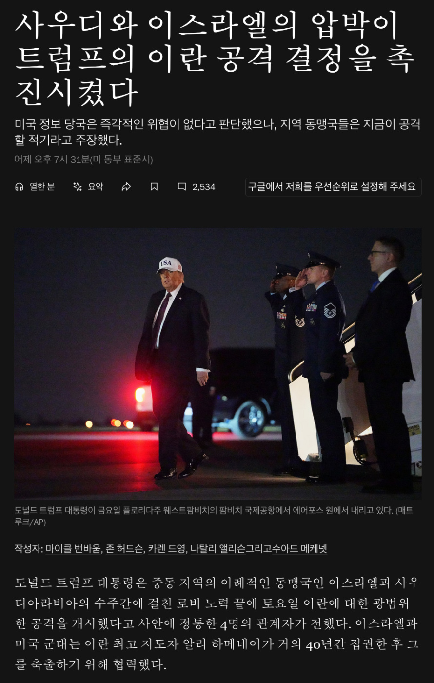 이번 공격을 통해 가장 큰 정치적 이익을 얻는 이는 당연히 네타냐후다. 이스라엘 의회의 예산안 통과 시한이 꼭 한달 남은 시점이다. 3월 31일까지 통과되지 않으면 의회는 해산된다. 과반 이하 연정이지만 각 정파가 원하는 요구사항을 들어주면서 집권을 이어갈 수 있겠지만 불투명했다. 10월 총선이 6개월 당겨질 가능성이 있었다. 가자 사태도 슬슬 국민 및 정치권의 피로도가 높아지면서 이스라엘 정치권도 네타냐후의 퇴진에 대한 그림을 그리기 시작했다. 전쟁이 계속되어야 하는 네타냐후에겐 가자나 서안지구에서의 공세를 넘어서는 포석이 필요했다. 중간선거를 앞두고 친네타냐후 유대인 재벌 미리엄 이들슨 등의 대미 정치자금 후원도 트럼프에겐 중요한 요건이었을 법하다. 압바스 아락치 이란 외교장관은 X에 미국은 '아메리카 퍼스트'를 '이스라엘 퍼스트'로 바꾸었고 이는곧 '아메리카 라스트'를 의미한다고 적었다.