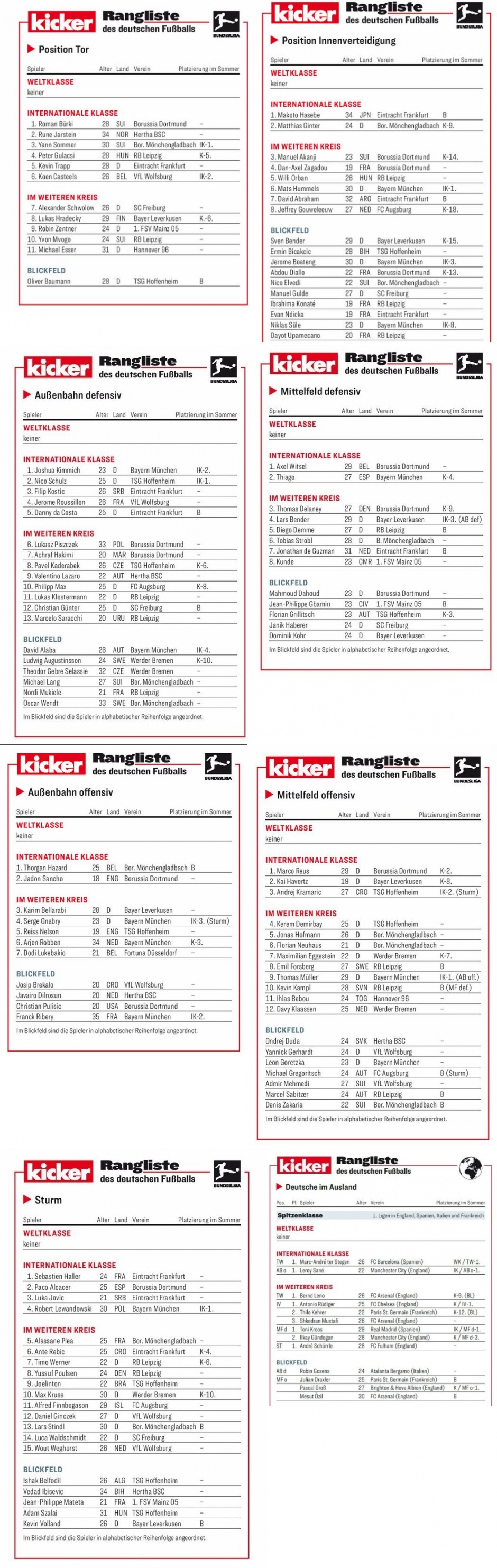 인용 : 분데스매니아 Raute님 http://bundesmania.com/xe/fuss/1859052 http://bundesmania.com/xe/fuss/1859420 http://bundesmania.com/xe/fuss/1859704 어쩌다보니 홍차넷 회원님의 글을 홍차넷으로 퍼오는 모양새가 되었군요. 한글화 된 선수 리스트는 링크 달아놓은 温泉卵님의 인용글에서 퍼왔습니다. 골키퍼 IK-1 로만 뷔르키 (도르트문트) - IK-2 루네 야르슈타인 (헤르타) - IK-3 얀 조머 (글랏드바흐) IK-1 IK-4 굴라시 페테르 (라이프치히) K-5 IK-5 케빈 트랍 (프랑크푸르트) - IK-6 코엔 카스텔스 (볼프스부르크) IK-2 K-7 알렉산더 슈볼로프 (프라이부르크) - K-8 루카스 흐라데키 (레버쿠젠) K-6 K-9 로빈 첸트너 (마인츠) - K-10 이본 음보고 (라이프치히) - K-11 미하엘 에서 (하노버) - B 올리버 바우만 (호펜하임) B 중앙수비수 IK-1 하세베 마코토 (프랑크푸르트) B IK-2 마티아스 긴터 (글랏드바흐) K-9 K-3 마누엘 아칸지 (도르트문트) K-14 K-4 단-악셀 자가두 (도르트문트) - K-5 빌리 오르반 (라이프치히) - K-6 마츠 후멜스 (바이언) IK-1 K-7 다비드 아브라함 (프랑크푸르트) B K-8 제프리 하벨레우 (아우크스부르크) K-18 B 스벤 벤더 (레버쿠젠) K-15 B 에르민 비차크치 (호펜하임) - B 제롬 보아텡 (바이언) IK-3 B 압두 디알로 (도르트문트) K-13 B 니코 엘베디 (글랏드바흐) - B 마누엘 굴데 (프라이부르크) - B 이브라히마 코나테 (라이프치히) - B 에반 은디카 (프랑크푸르트) - B 니클라스 쥘레 (바이언) IK-8 B 다요 우파메카노 (라이프치히) - 측면수비수 IK-1 요슈아 키미히 (바이언) IK-2 IK-2 니코 슐츠 (호펜하임) IK-1 IK-3 필립 코스티치 (프랑크푸르트) - IK-4 제롬 루시용 (볼프스부르크) - IK-5 대니 다 코스타 (프랑크푸르트) B K-6 우카쉬 피슈첵 (도르트문트) - K-7 아흐라프 하키미 (도르트문트) - K-8 파벨 카데라벡 (호펜하임) K-6 K-9 발렌티노 라자로 (헤르타) - K-10 필립 막스 (아우크스부르크) K-8 K-11 루카스 클로스터만 (라이프치히) - K-12 크리스티안 귄터 (프라이부르크) B K-13 마르셀로 사라키 (라이프치히) - B 다비드 알라바 (바이언) IK-4 B 루트비히 아우구스틴손 (브레멘) K-10 B 테오도르 게브르 셀라시에 (브레멘) - B 미하엘 랑 (글랏드바흐) - B 노르디 무키엘레 (라이프치히) - B 오스카 벤트 (글랏드바흐) - 수비형미드필더 IK-1 악셀 비첼 (도르트문트) - IK-2 티아고 (바이언) K-4 K-3 토마스 델레이니 (도르트문트) K-9 K-4 라스 벤더 (레버쿠젠) IK-3 (측면수비수) K-5 디에고 뎀메 (라이프치히) B K-6 토비아스 슈트로블 (글랏드바흐) - K-7 조나단 데 구즈만 (프랑크푸르트) B K-8 쿤데 (마인츠) - B 마흐무드 다후드 (도르트문트) - B 장-필립 바민 (마인츠) B B 플로리안 그릴리치 (호펜하임) K-3 B 야닉 하베러 (프라이부르크) - B 도미니크 코어 (레버쿠젠) - 공격형미드필더 IK-1 마르코 로이스 (도르트문트) K-2 IK-2 카이 하버츠 (레버쿠젠) K-8 IK-3 안드레이 크라마리치 (호펜하임) IK-2 (공격수) K-4 케렘 데미르바이 (호펜하임) - K-5 요나스 호프만 (글랏드바흐) - K-6 플로리안 노이하우스 (글랏드바흐) - K-7 막시밀리안 에게슈타인 (브레멘) K-7 K-8 에밀 포르스베리 (라이프치히) B K-9 토마스 뮐러 (바이언) IK-1 (측면공격수) K-10 케빈 캄플 (라이프치히) B (수비형미드필더) K-11 일라스 베부 (하노버) - K-12 다비 클라센 (브레멘) - B 온드레이 두다 (헤르타) - B 야닉 게르하르트 (볼프스부르크) - B 레온 고레츠카 (바이언) - B 미하엘 그레고리치 (아우크스부르크) B (공격수) B 아드미르 메흐메디 (볼프스부르크) - B 마르첼 자비처 (라이프치히) B B 데니스 자카리아 (글랏드바흐) B 측면공격수 IK-1 토르강 아자르 (글랏드바흐) B IK-2 제이든 산초 (도르트문트) - K-3 카림 벨라라비 (레버쿠젠) - K-4 세르주 나브리 (바이언) IK-3 (공격수) K-5 라이스 넬슨 (호펜하임) - K-6 아르옌 로벤 (바이언) K-3 K-7 도디 루케바키오 (뒤셀도르프) - B 요십 브레칼로 (볼프스부르크) - B 자바이로 딜로순 (헤르타) - B 크리스티안 풀리시치 (도르트문트) - B 프랑크 리베리 (바이언) IK-2 공격수 IK-1 세바스티앙 알레 (프랑크푸르트) - IK-2 파코 알카세르 (도르트문트) - IK-3 루카 요비치 (프랑크푸르트) - IK-4 로베르트 레반도프스키 (바이언) IK-1 K-5 알라사네 플레아 (글랏드바흐) - K-6 안테 레비치 (프랑크푸르트) K-4 K-7 티모 베르너 (라이프치히) K-6 K-8 유수프 풀센 (라이프치히) - K-9 조엘링톤 (호펜하임) - K-10 막스 크루제 (브레멘) K-10 K-11 알프레트 핀보가손 (아우크스부르크) - K-12 다니엘 긴첵 (볼프스부르크) - K-13 라스 슈틴들 (글랏드바흐) B K-14 루카 발트슈미트 (프라이부르크) - K-15 부트 베크호스트 (볼프스부르크) - B 이샥 벨포딜 (호펜하임) - B 베다드 이비세비치 (헤르타) - B 장-필립 마테타 (마인츠) - B 아담 살라이 (호펜하임) - B 케빈 폴란트 (레버쿠젠) B 해외파 IK 마르크-앙드레 테어 스테겐 (바르셀로나) WK IK 르로이 사네 (맨시티) IK K 베른트 레노 (아스날) K K 안토니오 뤼디거 (첼시) K K 틸로 케러 (파리) K K 슈코르단 무스타피 (아스날) - K 토니 크로스 (레알) IK K 일카이 귄도안 (맨시티) K K 안드레 쉬얼레 (풀럼) - B 로빈 고젠스 (아탈란타) - B 율리안 드락슬러 (파리) B B 파스칼 그로스 (브라이턴) K B 메수트 외질 (아스날) B 월드클래스 전멸입니다. 해외파까지 전부 포함해서 말이