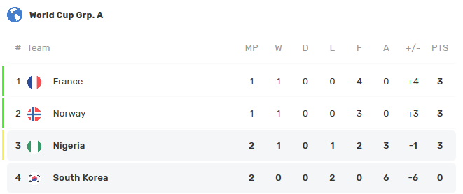 2019. 06. 12. 나이지리아 2 - 0 한국 U-20 월드컵에서는 계속해서 좋은 소식이 이어지고 있지만 여자 축구 월드컵에서는 아쉬운 소식이 이어지고 있네요. 피지컬 차이가 꽤나 나는 듯한 느낌입니다. 무득점에 득실차 -6인 2연패를 기록중이라 와일드카드를 노리는 것도 많이 힘들어지지 않았나 싶습니다. 최종전 일정은 노르웨이와 화요일 새벽 4시. 0