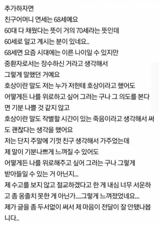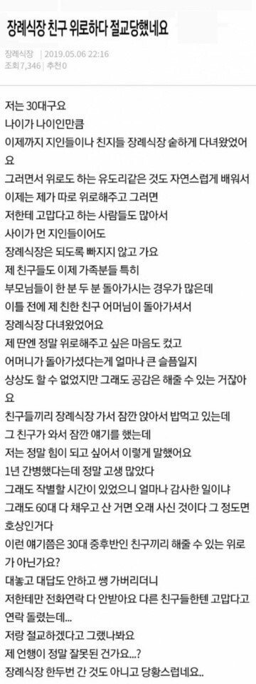 | Subject | 장례식장 다녀왔는데 친구에게 절교 당했네요..... |