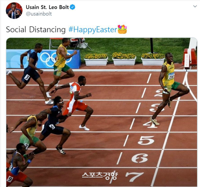 우사인 볼트가 사회적 거리두기에 참여하는 모습이다.