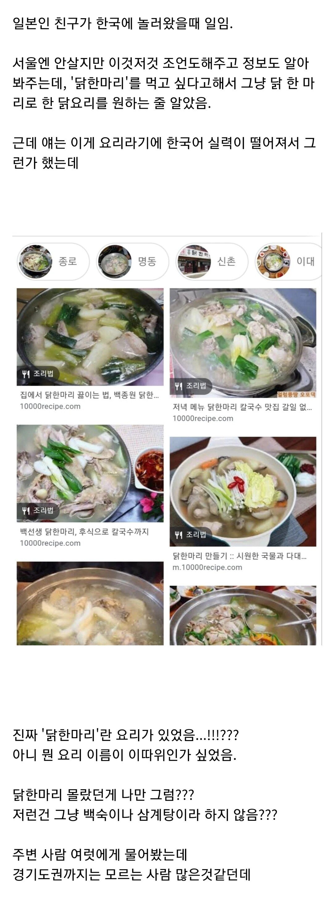 저도 처음에 저거 요리 보고 이름이 닭한마리라고?? 했습니다. 알게된지도 오래 안됐구요..ㅎㅎ