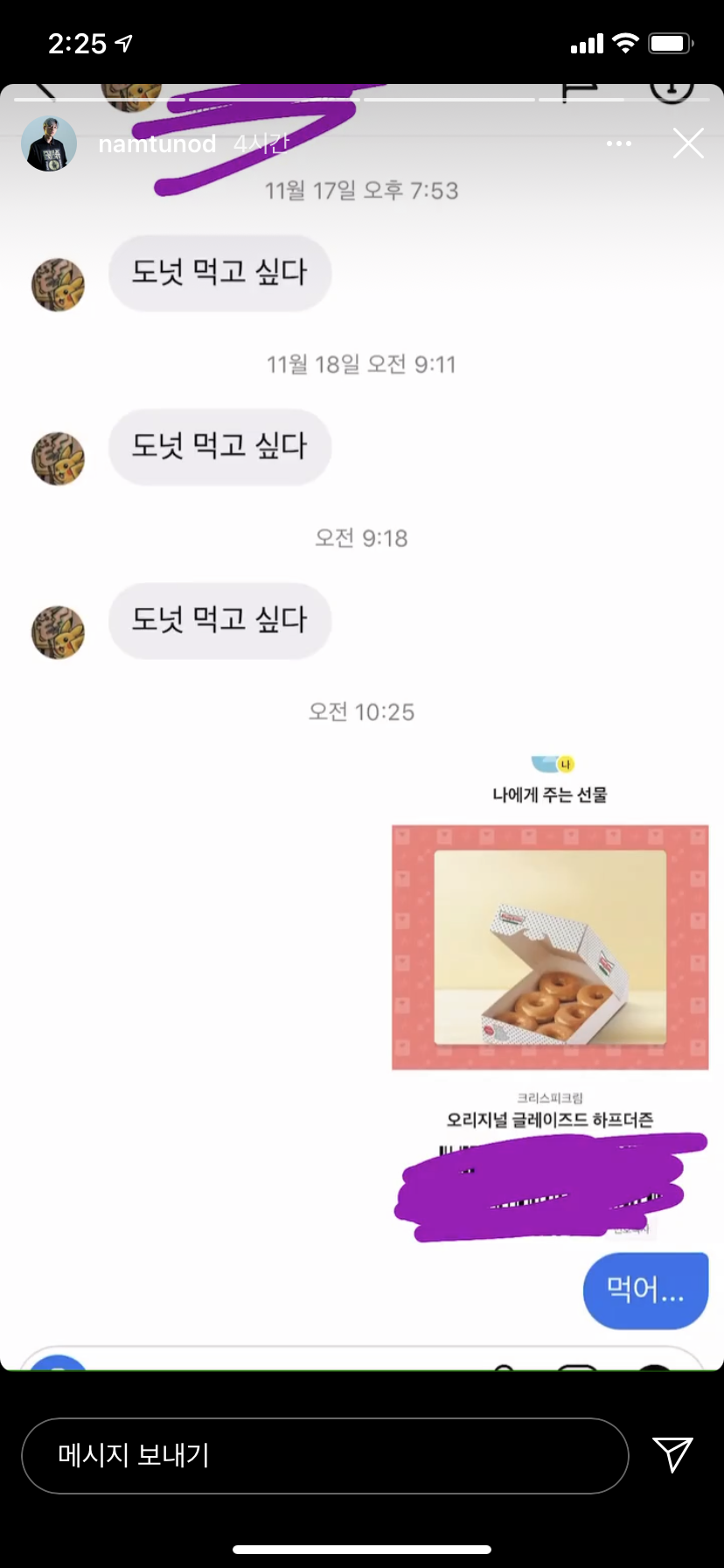 어떤 사람이 2019년부터 DM으로 꾸준히 도넛맨한테 도넛 먹고 싶다고 보냄. 그리고 진짜 도넛맨이 도넛을 선물함 ㅋㅋㅋㅋ