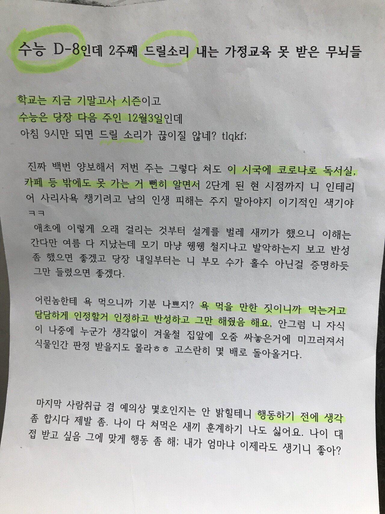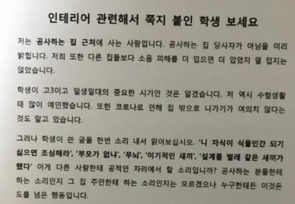 저희 아파트도 인테리어 공사 많이 하는 편인데 주말 아침부터 혹은 평일 오전 9시도 되기 전에 공사 소음 나면 짜증이 나긴 하는데 저런 패드립은 도를 넘어도 한참 넘었죠.