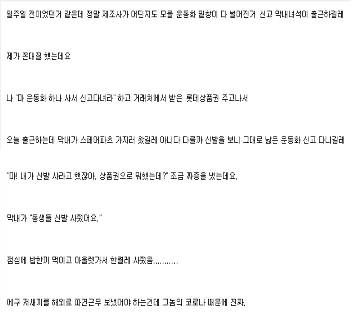 | Subject | 신입이 해진 운동화를 신고 왔다 |