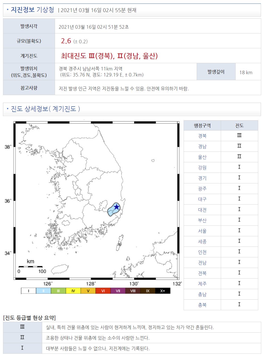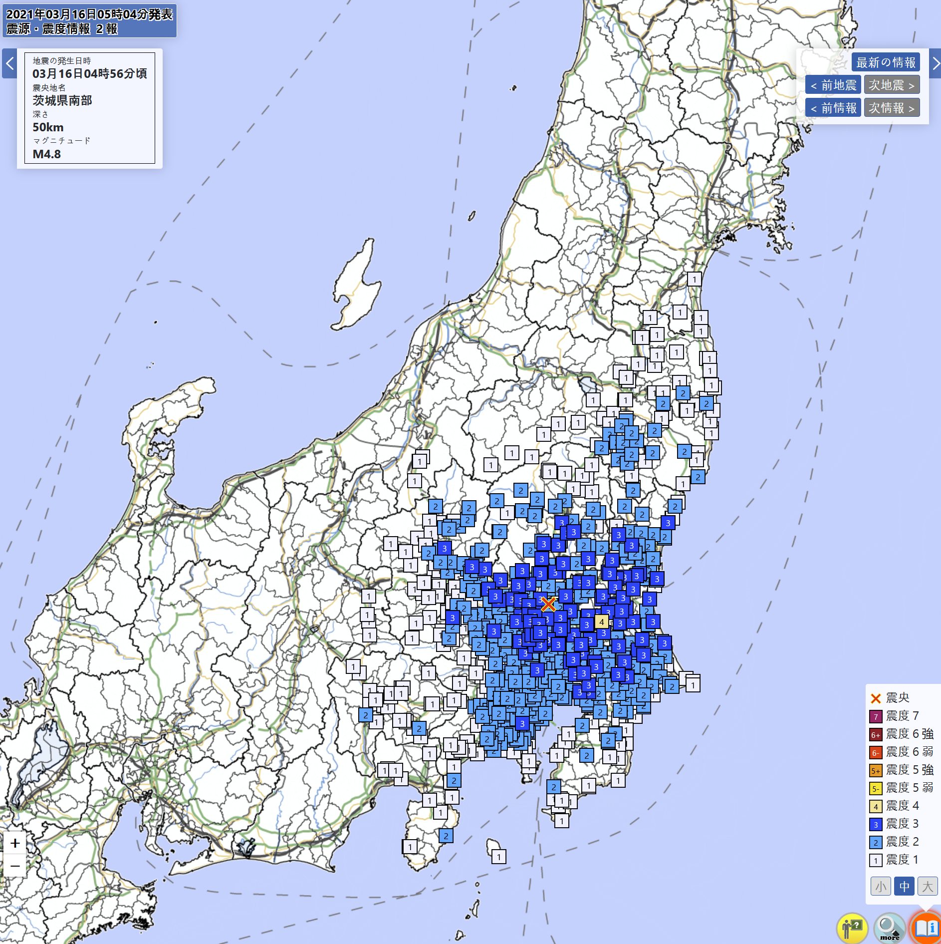 기상 시간(?)이라 놀라 일어난 분들도 제법 있을 것 같습니다. 일본 기상청에 따르면, M4.8이군요. 최근 며칠 일본에는 M4.6 ~ M4.9 지진들이 있었습니다만, 오늘은 인구가 집중된 도쿄에 가깝군요. 도쿄도 조금 흔들렸다고 하는군요. 우리나라면 일본 진도 기준 3~4도 많이 놀랄 지진이겠죠. https://www.jma.go.jp/bosai/map.html#8/36.941/139.249/&elem=int&contents=earthquake_map 우리나라도 새벽에 경주에서 지진이 있었습니다. https://www.weather.go.kr/XML/INTENSITY/i_3_20210316025152.html 0