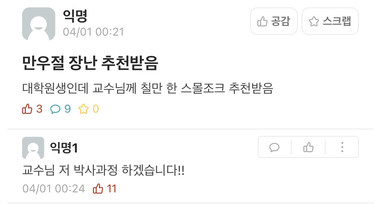 - 유머가 아닌 펌글, 영상 등 가볍게 볼 수 있는 글들도 게시가 가능합니다.
