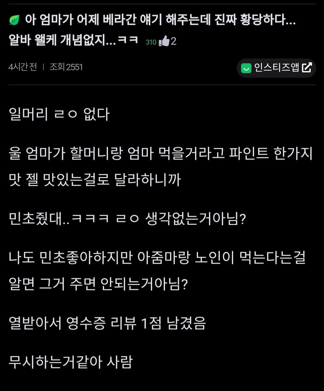 정확하게 원하는걸 말해줘야 추천이 편하긴 한데 그래도 호불호 심한 민초를 주는건 좀.. 그냥 무난하게 엄마는 외계인같은걸 주지.. 1