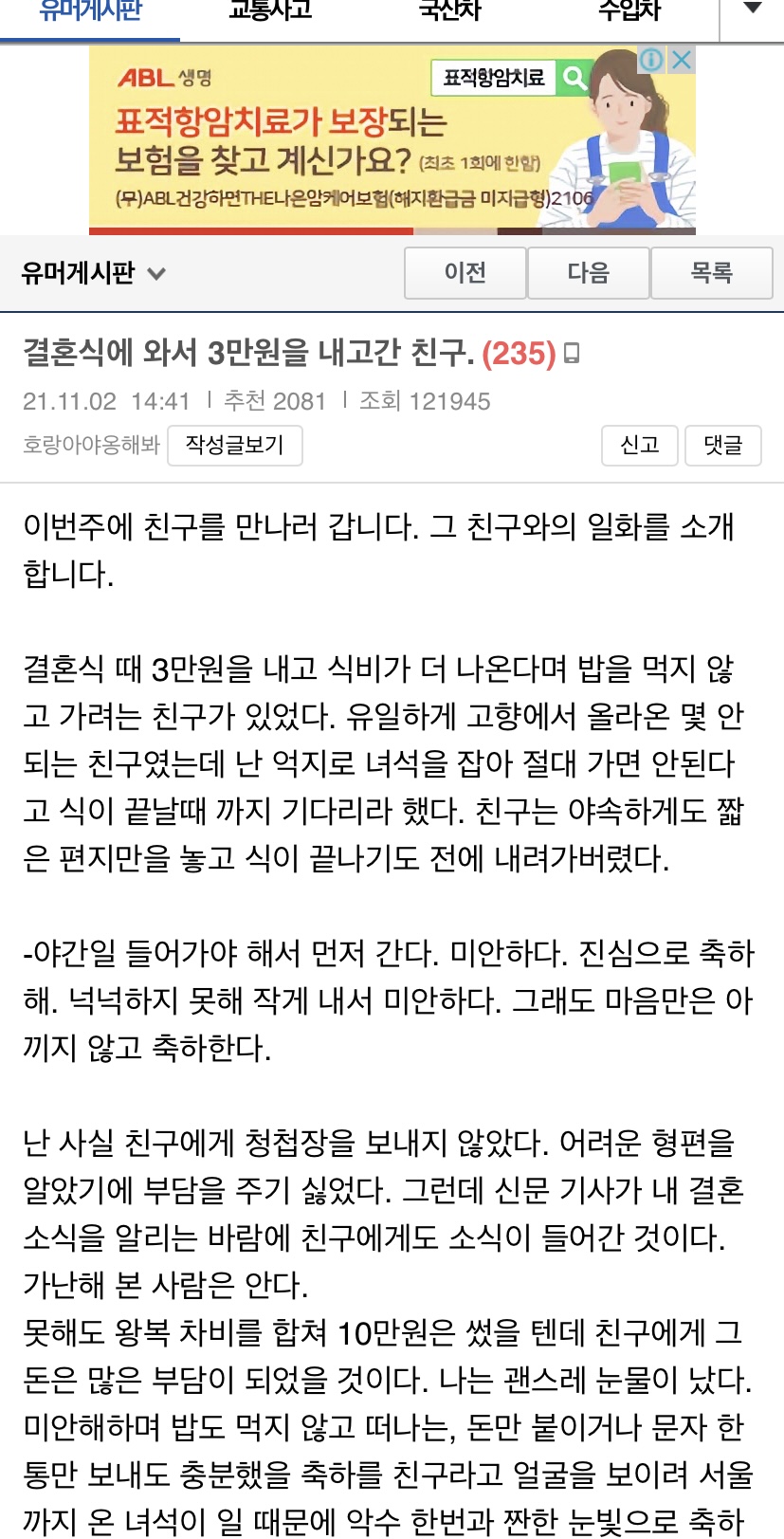 Subject   결혼식에 와서 3만원을 내고간 친구