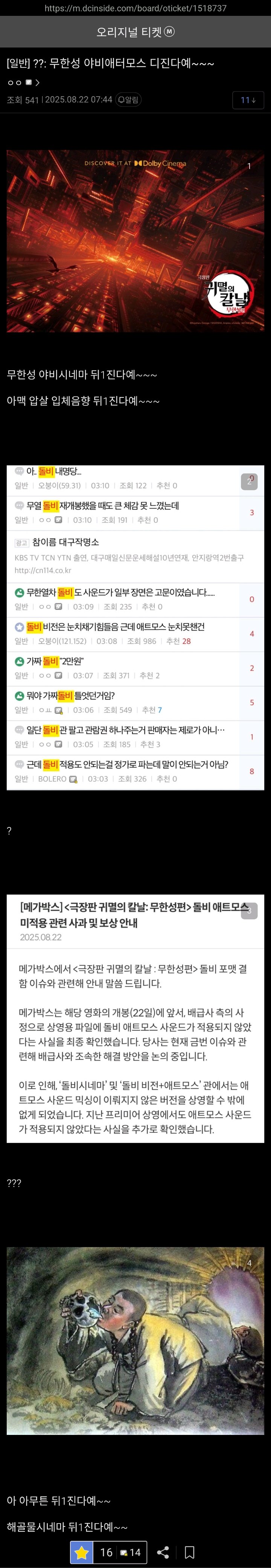 오늘 개봉해서 역대급 인파가 몰린 귀멸의 칼날 가장 비싸고 장비 좋은 영화관에서 새벽런으로 본 사람들이 역대급 음향이라며 주접을 떨었지만 실제로는 돌비 적용이 안된채 상영된게 공식적으로 확인 ??? : 아무튼 음향 쩔었다니까..!! 0