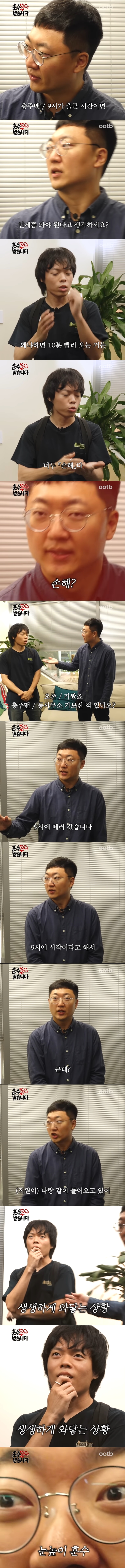 충주맨 : 동사무소에 9시 시작이라고 해서 뭐 떼러 갔는데 이 새끼가 나랑 같이 들어오고 있으면 어떤 기분이 드실 것 같아요? 존중해 주시겠습니까? 0