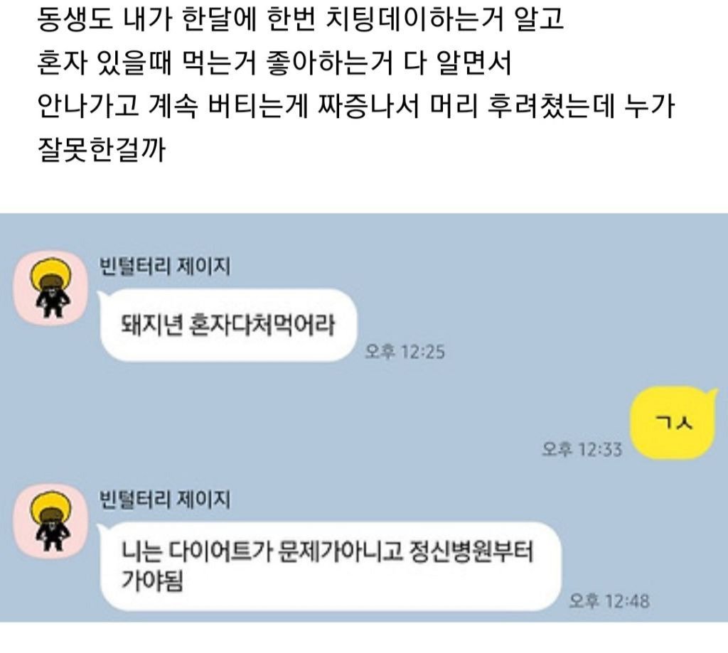 전 한입충을 극혐하는지라....물론 머리를 냄비로 후린건 잘못한 일이지만...동생의 잘못이 조금 더 크다고 봅니다 ㅋㅋㅋㅋ