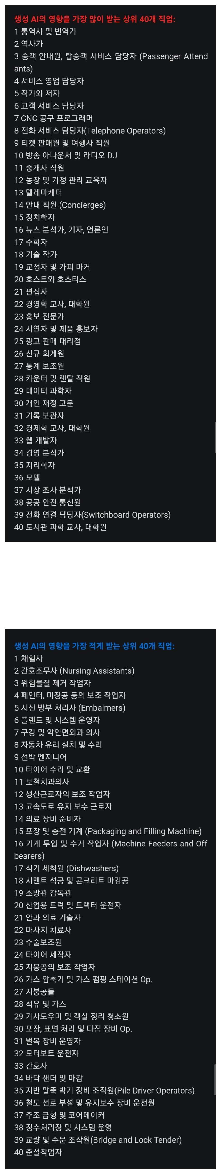 마이크로 소프트 연구진 발표  A.I에 영향을 받는 받지않는 직업군 40