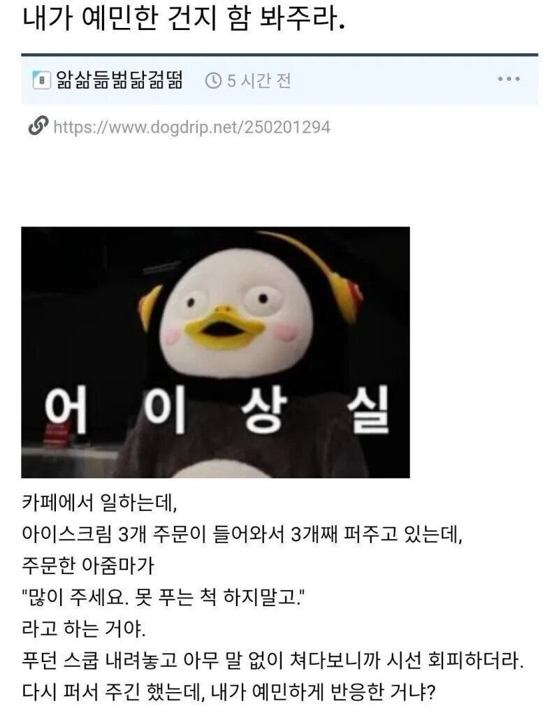 자영업 초기나 알바한지 얼마 안됐으면 빡치죠 ㅋㅋㅋ 지금의 저라면 능글늘글 웃으면서 이미 많이 퍼드렸는데요하면서 웃겠지만 ㅋㅋ 1