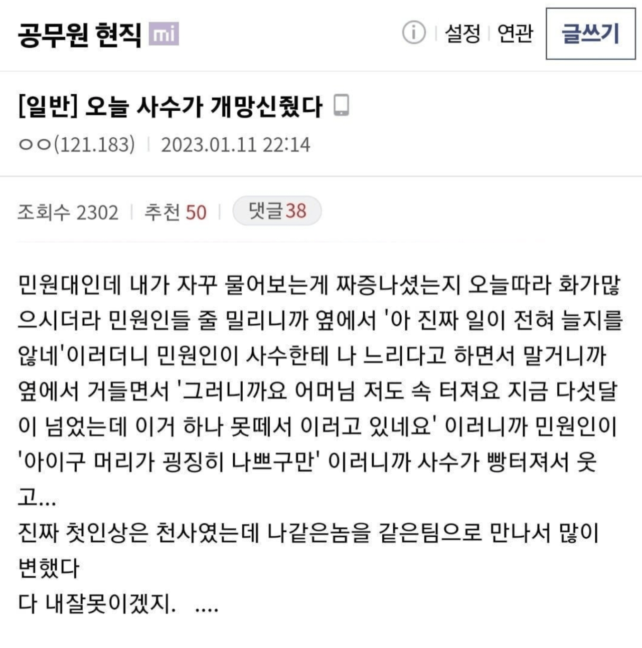 아니 일못하면 짜증날순 있는데 민원인 앞에서 그러는건 좀…따로 불러서 얘길하지..