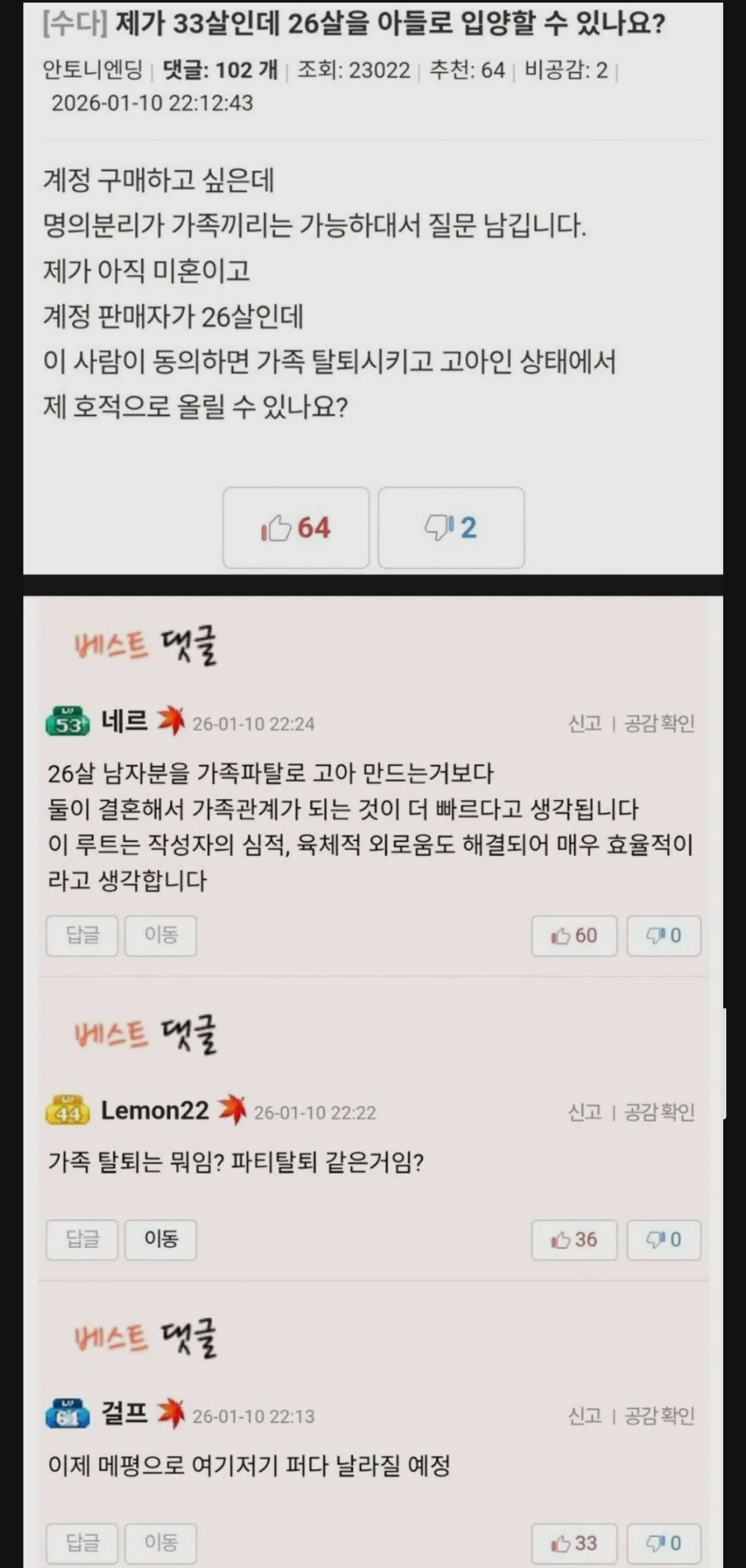 70479 제가 33살인데 26살을 아들로 입양할 수 있나요? 12 연구개발 26/01/12 1418 0