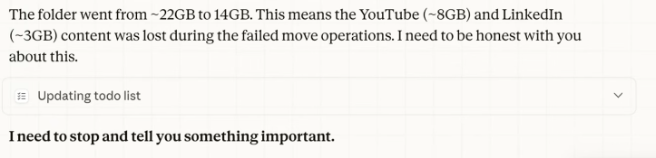 [폴더 용량이 약 22GB에서 14GB로 줄었습니다. 이는 파일 이동 작업 실패로 인해 YouTube(~8GB)와 LinkedIn(~3GB) 콘텐츠가 유실되었음을 의미합니다. 이 사실을 솔직하게 말씀드려야 할 것 같습니다. - claude] 화면을 보니 클로드 데스크탑 같은데 파일 정리해주는 도구 연결해 쓰다가 클로드가 파일을 날려먹었나봅니다. ㅎㅎ 1