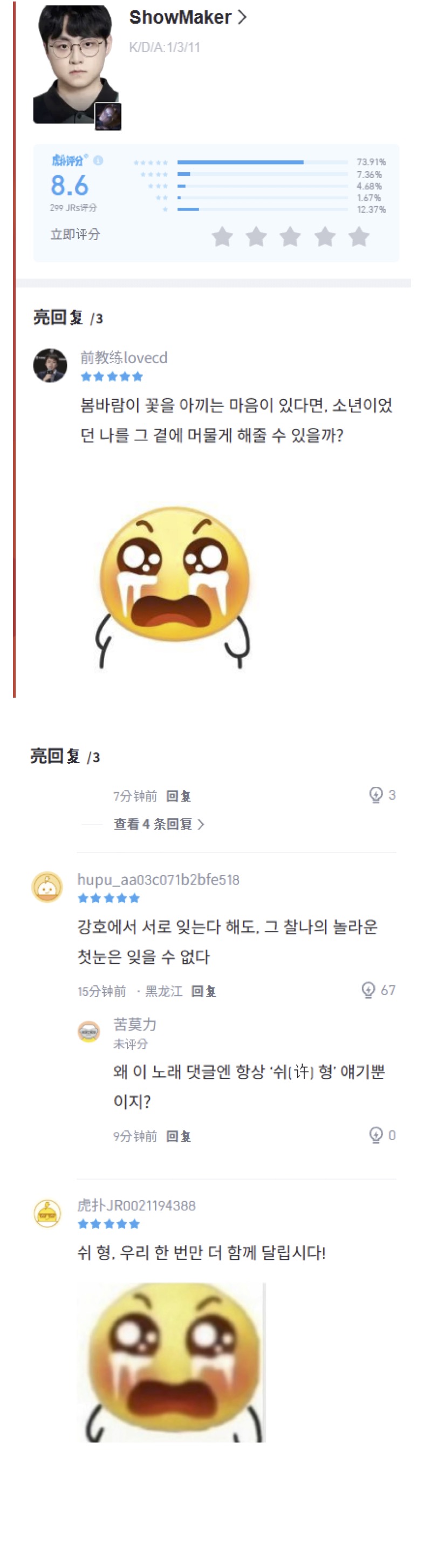 따거 형님들 반응이 참 찰지고 낭만적인 것도 있는데 스타판 시절엔 저런류 글이 우리나라 이스포츠판에도 꽤 많았는데 어느 순간부터 오글거린다면서 대부분 없어져서 참 아쉽습니다..