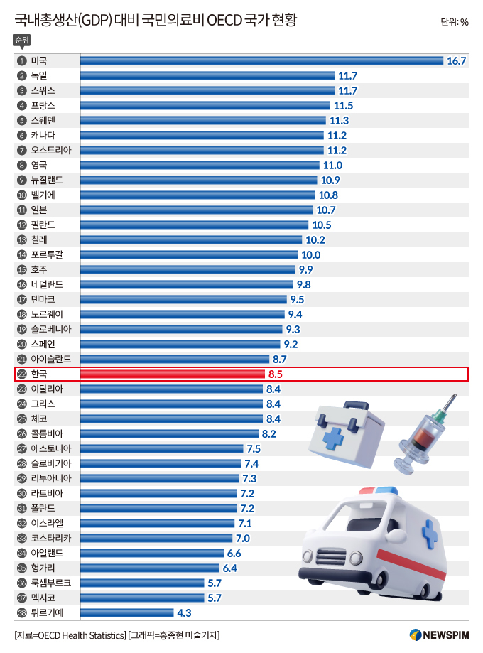 다만 한국의 GDP 대비 국민의료비 비중 증가 속도는 OECD 국가 평균에 비해 여전히 빠르다. 2015년과 2023년 OECD 국가 평균 차이는 0.4%포인트(p) 차이가 난다. 반면 2015년과 2023년 GDP 대비 국민의료비 비중 차이는 2%p 차이가 난다.