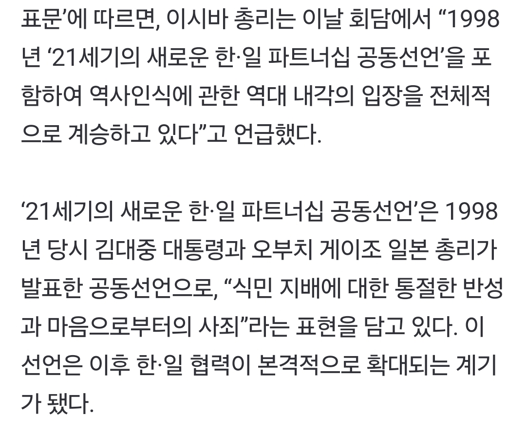 Subject   이시바 “‘김대중-오부치 선언’ 포함 역사인식 계승”···한·일 정상 공동발표문