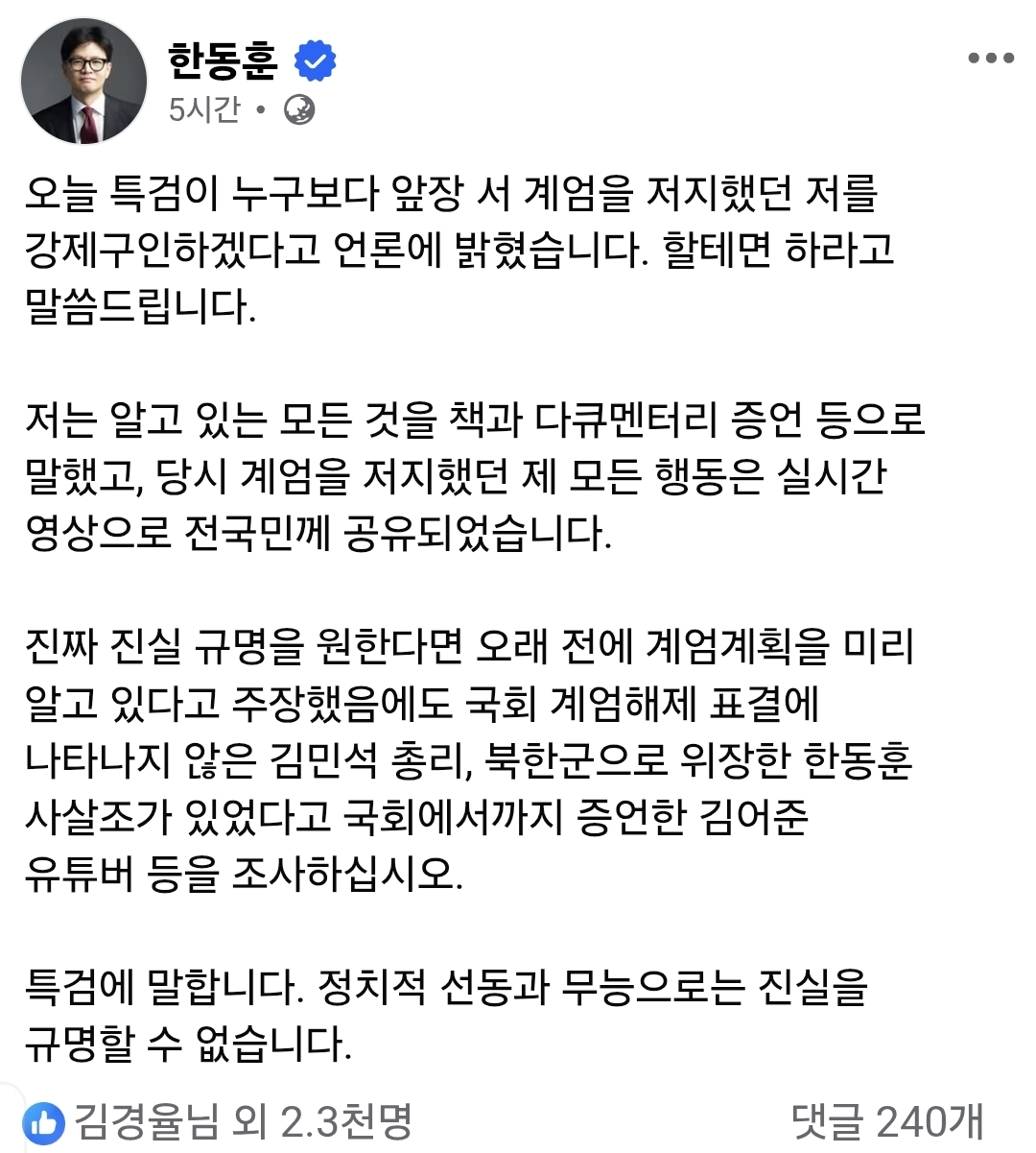 특검팀은 계엄 해제 방해 의혹과 관련해 한 전 대표의 진술이 꼭 필요하다고 보고 있다.///