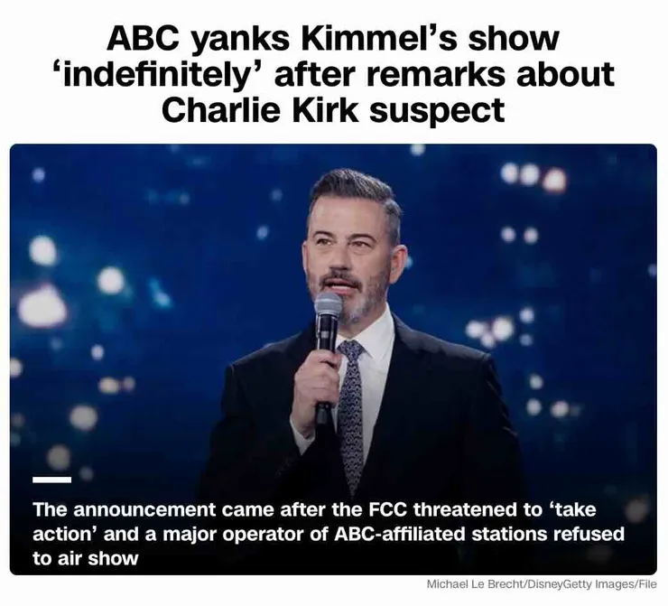 ABC 방송국은 키멜의 발언 이후 《Jimmy Kimmel Live!》를 무기한 방송 중단(suspension)하기로 결정했습니다.