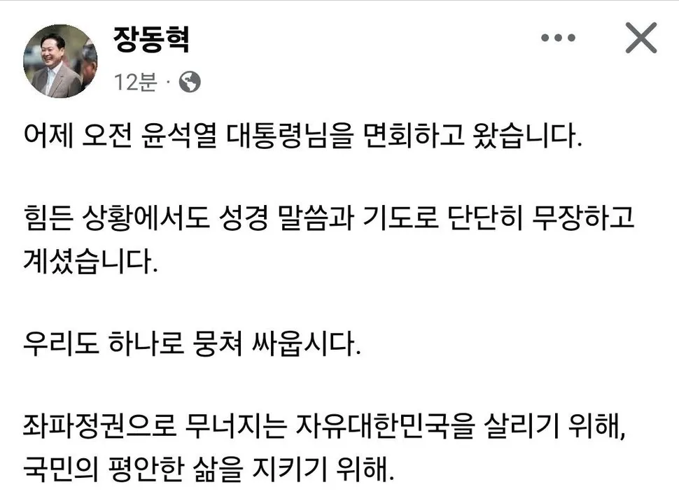 정치국힘 장동혁, 윤석열 면회…“성경·기도로 무장하고 계셔…우리도 싸우자” 14 |