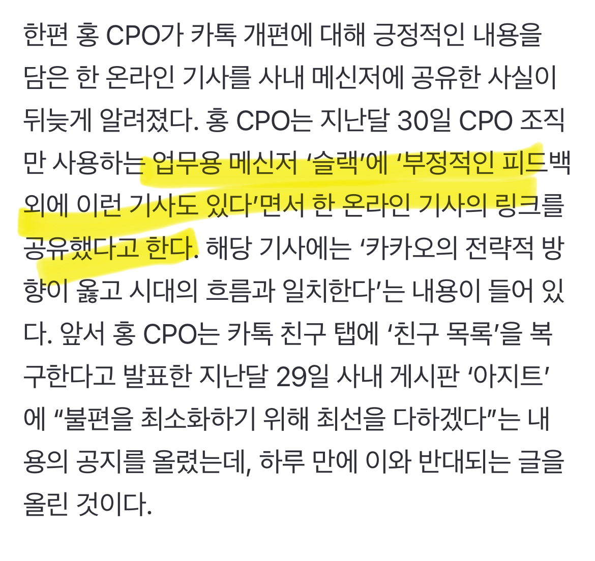 Subject   ‘카톡 개편’ 주도 홍민택 카카오 CPO 사내 회의 잇단 불참