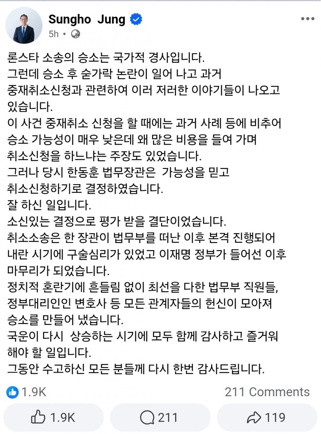 Subject   정성호 "한동훈, 론스타 소송 잘한 일... 소신 있는 평가 받을 결단"