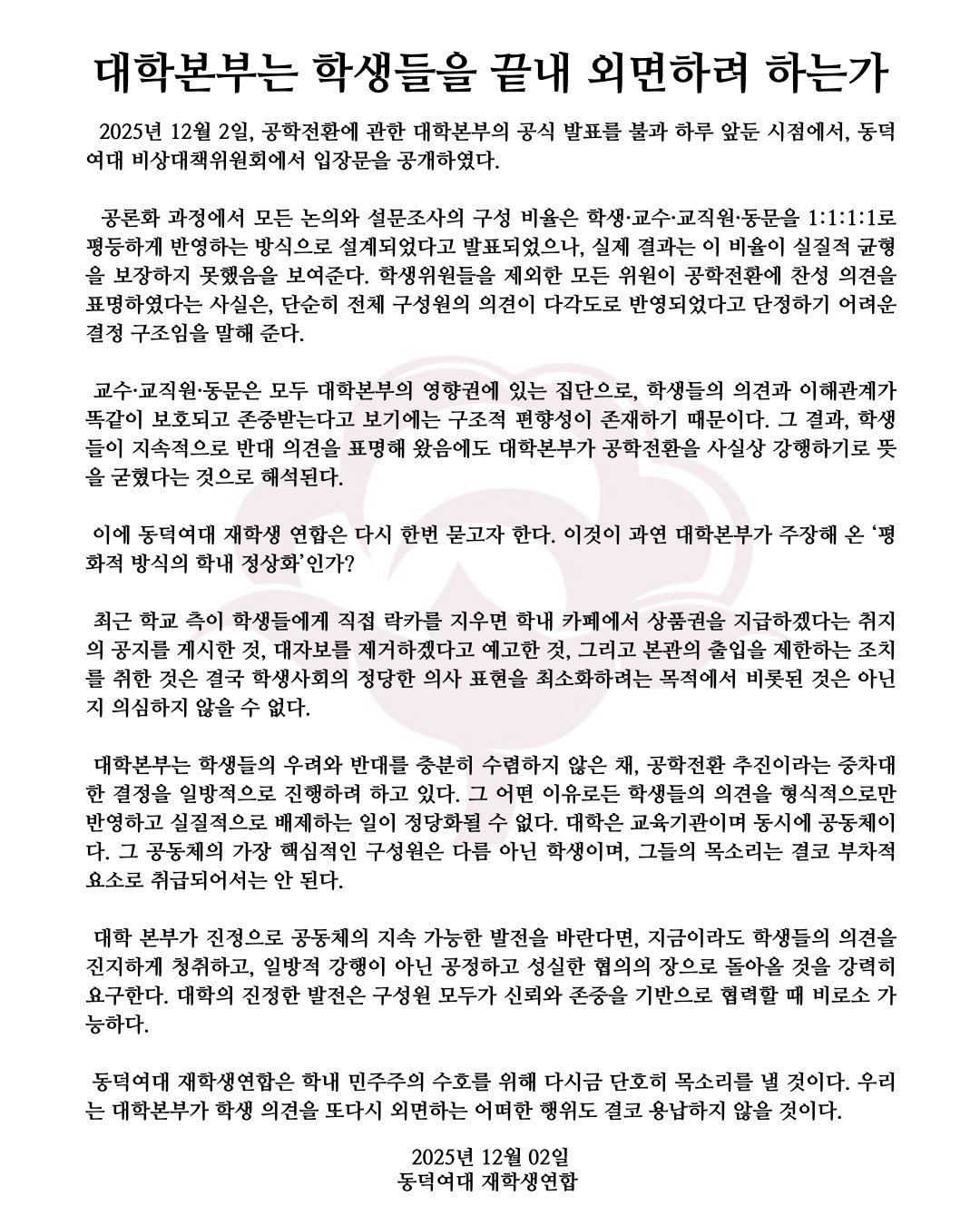 4048 사회'1년 전 래커칠' 동덕여대 "2029년부터 남녀공학 전환" 23 다군 25/12/03 1110 0
