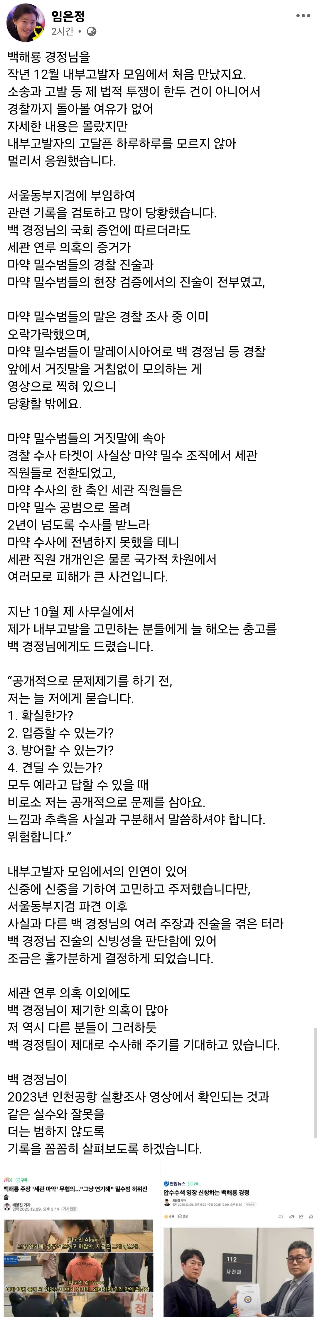 '마약밀수 의혹' 세관 직원들 무혐의…"'수사 외압'도 근거없어"(종합) https://www.yna.co.kr/view/AKR20251209094751004 네.. 이 건은 이제 시마이쳐도 될것 같군요. 세관직원 7명 전원 무혐의. 외압을 행사했다고 의혹이 제기된 경찰공무원 전원 무혐의. 경찰공무원들이나 세관직원들이나 그 누구도 대통령실 관계자와 통화한 사실을 확인하지 못했고 오히려 말레이시아 밀수범들이 말레이시아어로 자기들끼리 대화하면서 경찰 앞에서 허위진술을 지시했던 내용이 녹화된 비디오를 찾아냈다고 하는군요. 백 경정이 문제삼았던 갑작스러운 브리핑 연기와 보도자료 수정 지시 또한 백 경정이 공보규칙상 필요한 서울청 수사부장과 경찰청 국수본 마약계에 사전보고를 하지 않았으며 세관을 압수수색하기 수 시간 전 보도자료 배포와 언론 브리핑을 단행해 수사기밀 유출 우려가 있었기에 경찰 공보규칙에 따른 적법한 업무 지시로 판단했다고 합니다. 그러니까 그냥 마약 밀수범들이 마약을 밀수하다 걸린거지 세관직원이랑 내통을했다거나 하는거랑은 별 상관 없었다... 이런 얘깁니다. 1