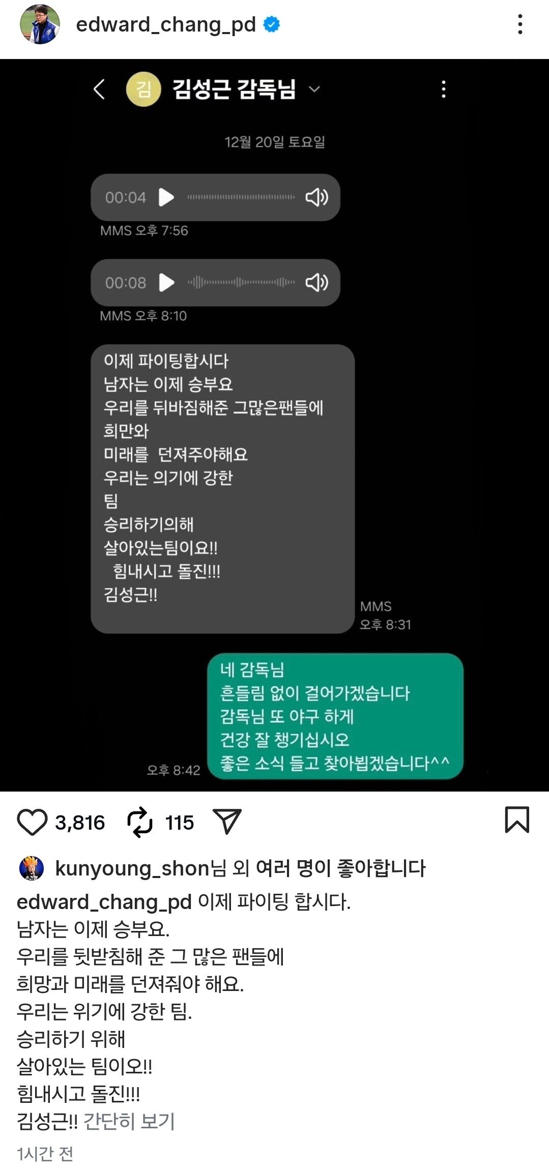| Subject | '불꽃야구' 문 닫게 생겼는데…장시원 PD, 사적 대화 공개했다 |