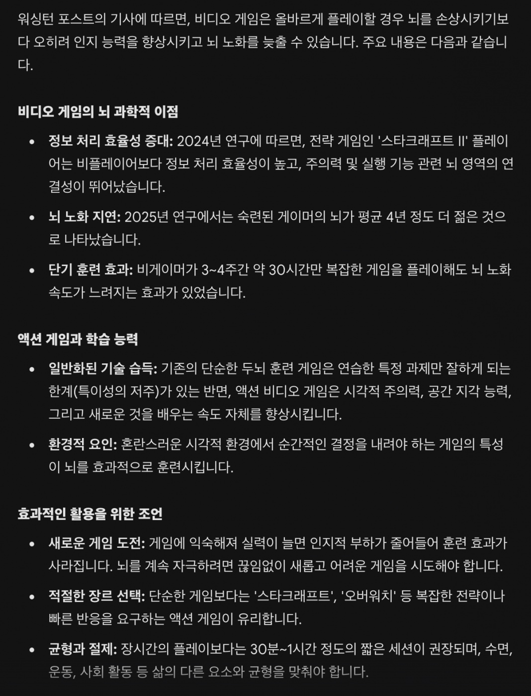 https://www.yna.co.kr/view/AKR20251222074200009 https://www.washingtonpost.com/wellness/2025/12/21/video-games-brain-cognition-boost/ 게임을 옛날에도 많이는 안 했지만, 그래도 한 10년 전까지는 FPS 게임도 하고 했었는데. 이제 스팀 계정 비번도 기억 안 납니다. 슬슬 게임을 다시 해봐야 하려나요? 요즘 인지능력이 좀 떨어진 것 같은데! 0