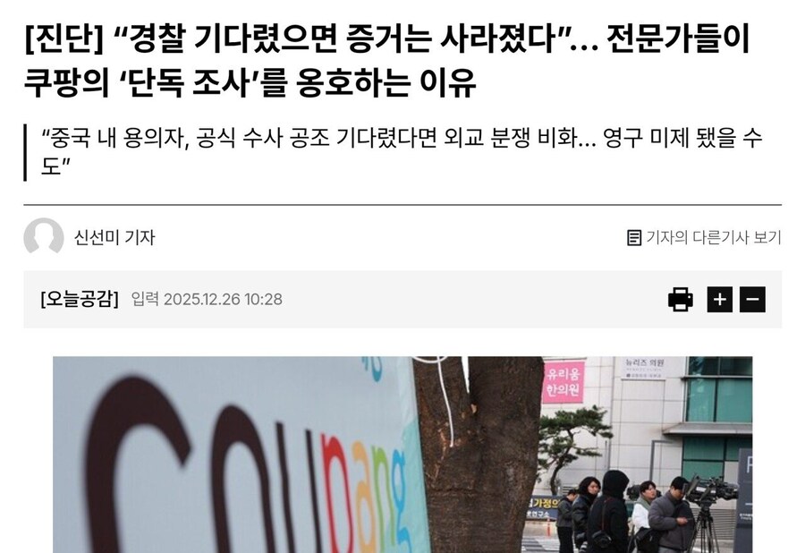 이웅혁 건국대 경찰학과 교수는 연합뉴스에 “살인사건에 비유하면 경찰이 시체를 찾지 못한 상황에서 쿠팡이 시체를 다른 장소로 옮긴 것과 마찬가지”라고 말했다.