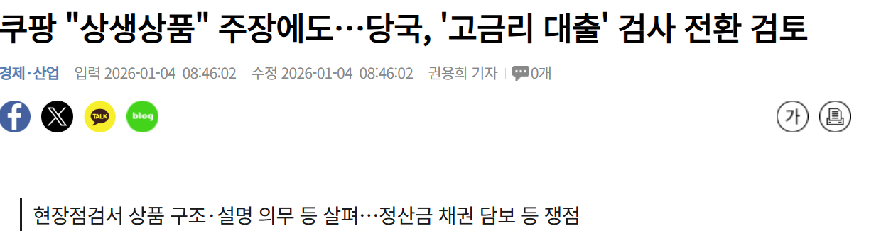 | Subject | 쿠팡 "상생상품" 주장에도…당국, '고금리 대출' 검사 전환 검토 |