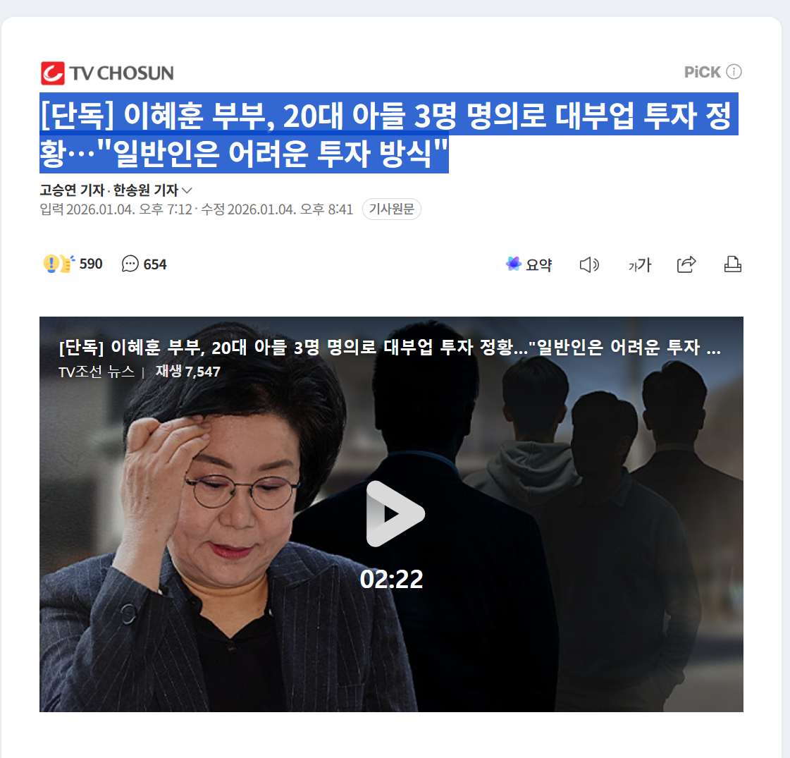 | Subject | 이혜훈 부부, 20대 아들 3명 명의로 대부업 투자 정황…"일반인은 어려운 투자 방식" |