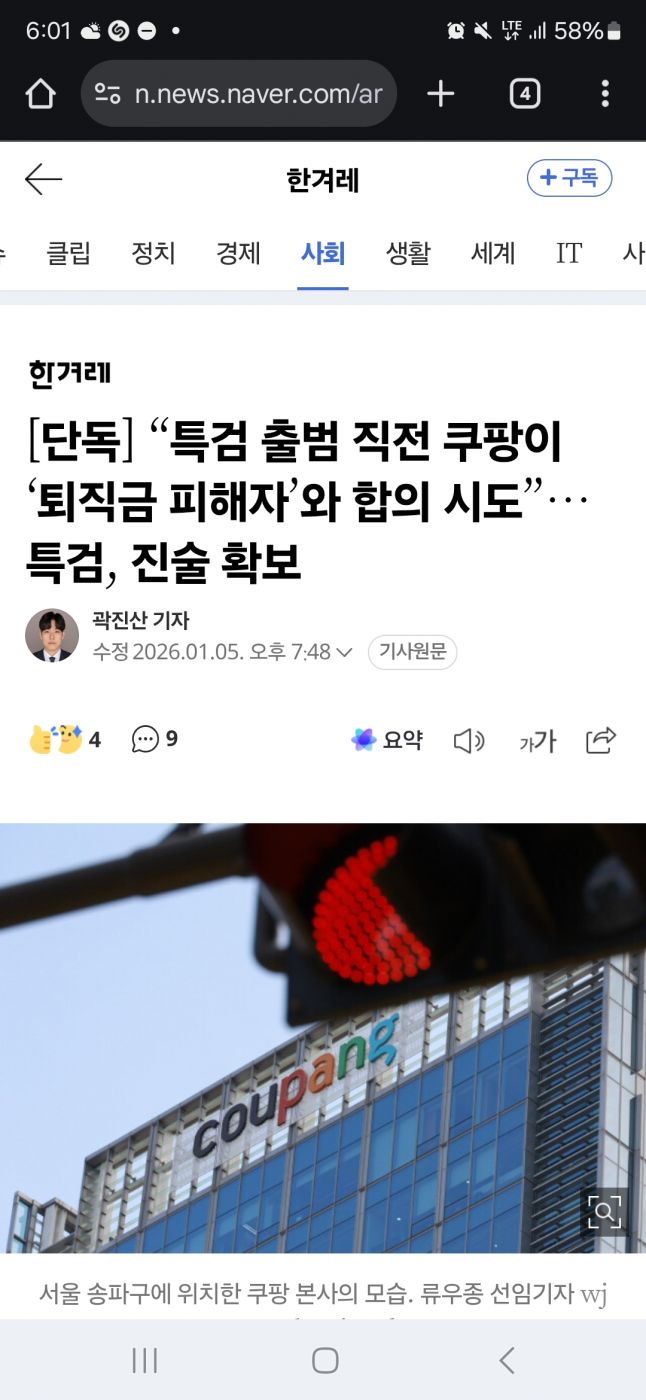 5일 한겨레 취재 결과, 안권섭 특별검사팀은 지난달 쿠팡의 퇴직금 미지급으로 민사소송을 낸 ㄱ씨를 조사하면서 ‘쿠팡 쪽이 지난해 10월20일과 12월3일 두차례 접촉해 합의하려 했다’는 취지의 진술을 확보했다.