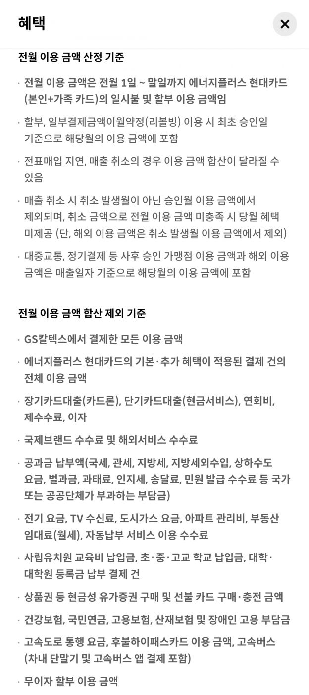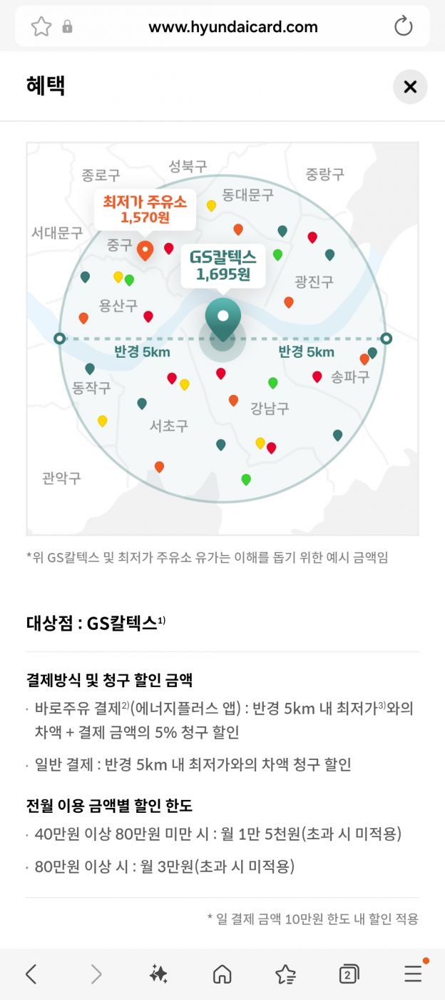 전국 어느 GS칼텍스 주유소에서 주유하든 반경 5㎞ 이내에 있는 국내 4대 정유사(GS칼텍스·SK에너지·S-Oil·HD현대오일뱅크)와 알뜰주유소에서 판매 중인 동일 유종의 최저가를 적용받는다고 합니다. (연회비 1만원, 이름은 에너지 플러스 현대카드)