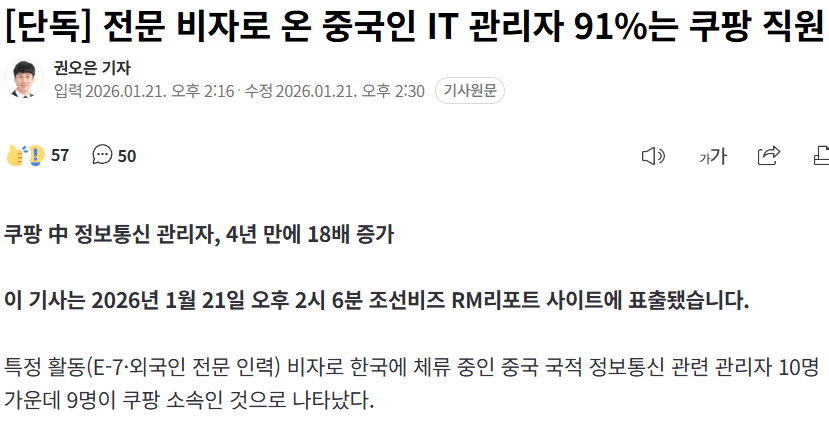 4444 경제전문 비자로 온 중국인 IT 관리자 91%는 쿠팡 직원 8 활활태워라 26/01/24 884 0