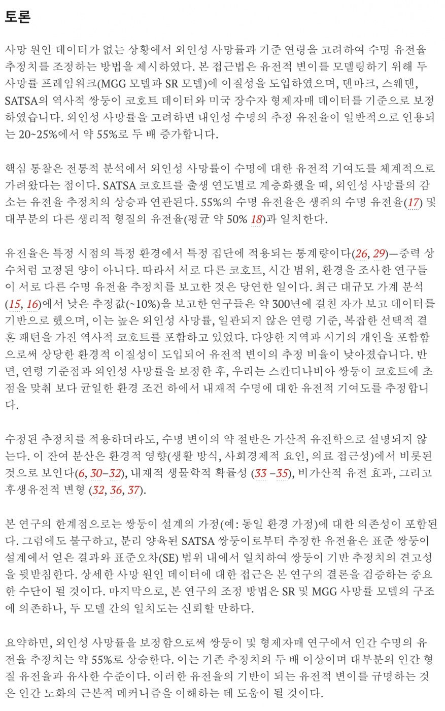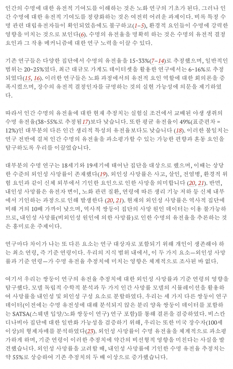 https://www.yna.co.kr/view/AKR20260129192700017 기존에 많이 인용되었던 연구 데이터들에서 외인성 사망 등 노이즈를 통계적으로 많이 제거하니 키, 몸무게 같은 인간의 신체 특징 등 인간 형질 유전율이나 다른 종의 수명 유전율과 유사한 수준으로 (연구진이 정의한) 수명 유전율도 높아졌다고 합니다. 1