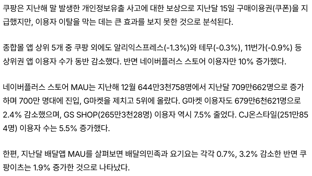 Subject   쿠팡, 개인정보 유출 후폭풍…1월 이용자 110만 명 '탈팡'
