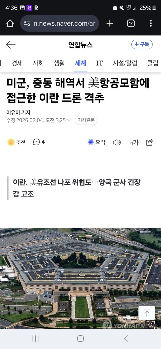 워싱턴=연합뉴스) 이유미 특파원 = 미국의 대(對)이란 군사개입 가능성이 부상한 가운데, 미군이 3일(현지시간) 중동 인근 해역에 배치된 미 항공모함에 접근한 이란 드론을 격추했다.
