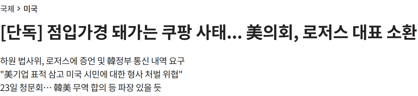 | Subject | 점입가경 돼가는 쿠팡 사태... 美의회, 로저스 대표 소환 |