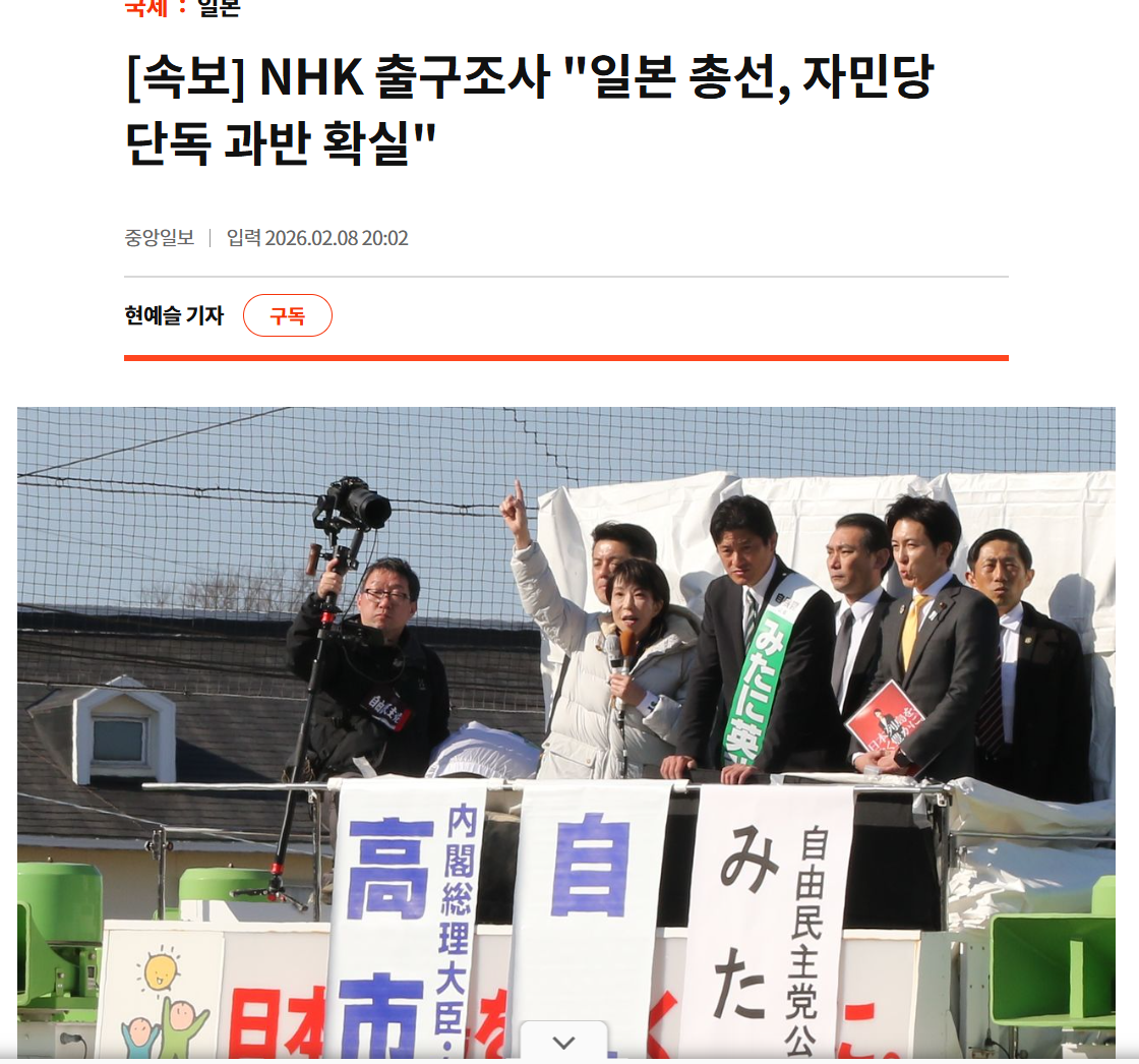 4584 국제NHK 출구조사 "일본 총선, 자민당 단독 과반 확실" 19 + 활활태워라 26/02/08 562 0