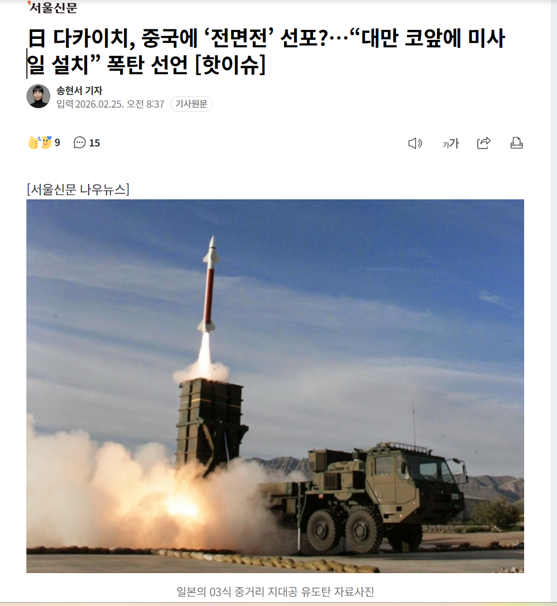 | Subject | 日 다카이치, 중국에 ‘전면전’ 선포?…“대만 코앞에 미사일 설치” 폭탄 선언 |